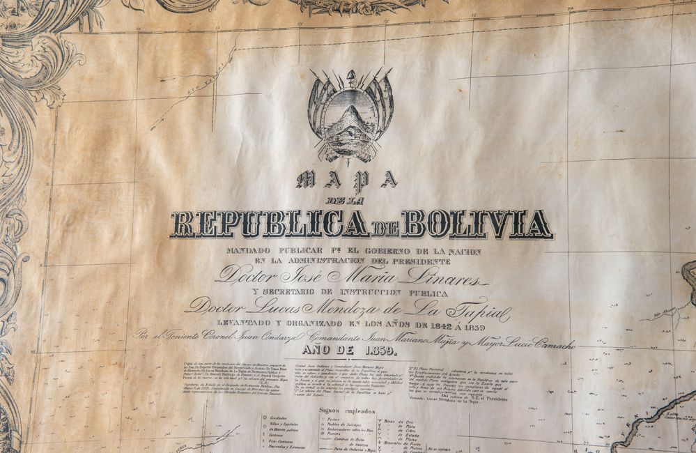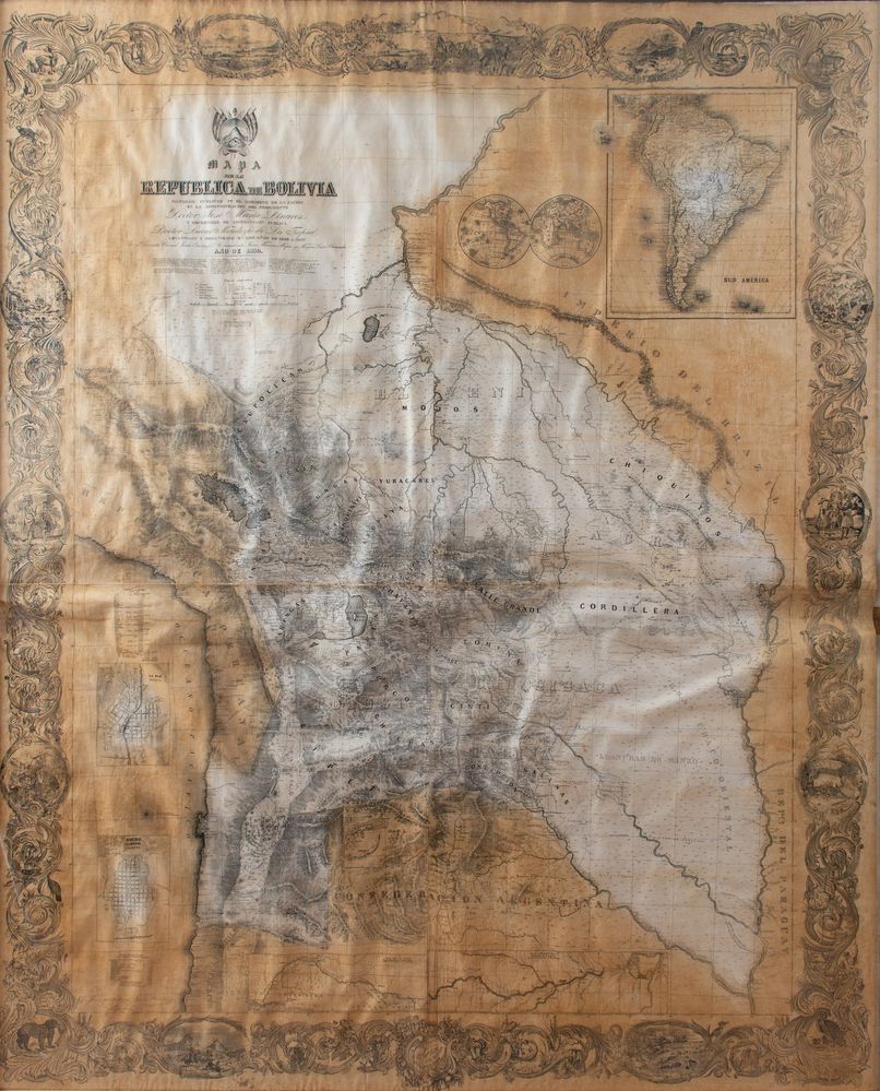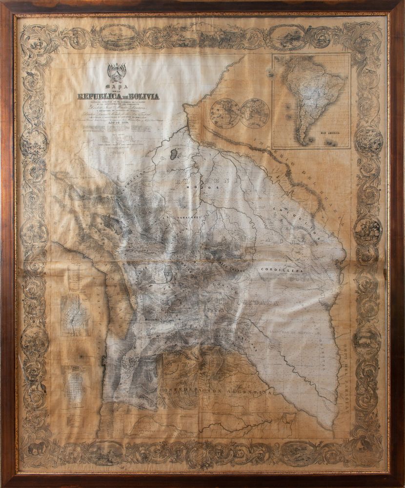 Grande mappa raffigurante la Repubblica della Bolivia. Incisione su carta. Cm 177x143.