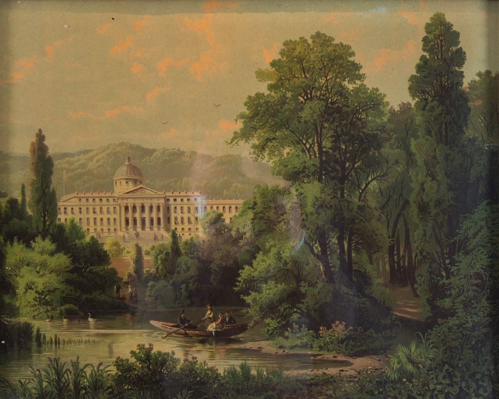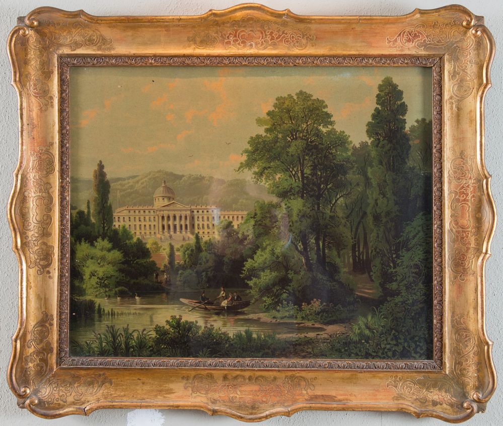 Maestro del XIX secolo. "Paesaggio". Olio su tela. Cm 45x56. Dipinto entro cornice cabaret.