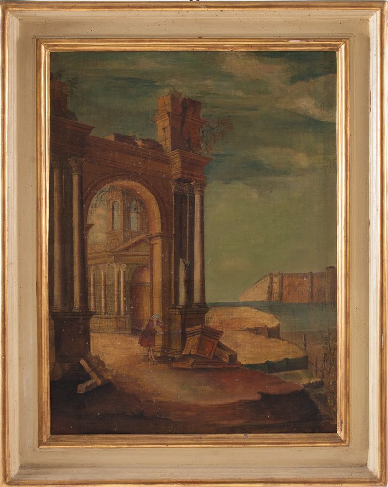 Maestro del XVII secolo. "Capriccio architettonico". Olio su tela. Cm 80,5x60.
