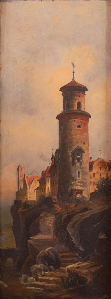 ALBERTO GIACOMAZZI (Venezia 1890 - Bologna 1969) "Paesaggio Fiammingo", 1921. Olio su tavola. Cm 87,5x33,5. Opera firmata in basso A. F. Giacomazzi, al retro reca titolo, firma e data Paesaggio Fiammingo Alberto F. Giacomazzi 1921.