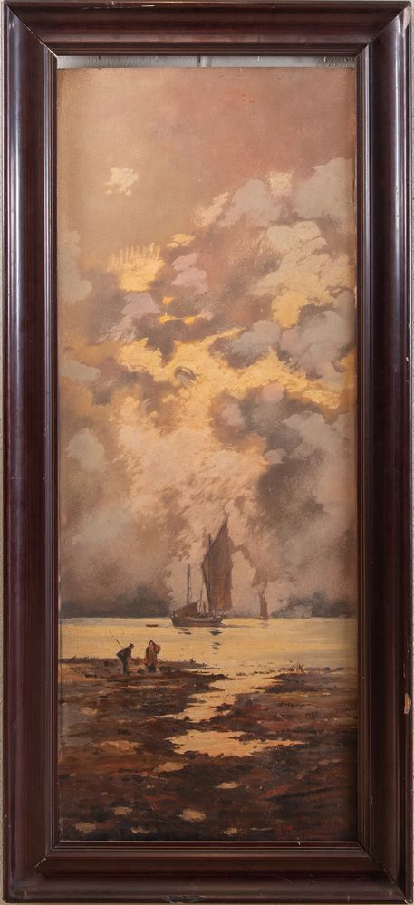 ALBERTO GIACOMAZZI (Venezia 1890 - Bologna 1969) "Marina". Olio su tavola. Cm 96x37,5. Opera firmata in basso a destra A. F. Giacomazzi.