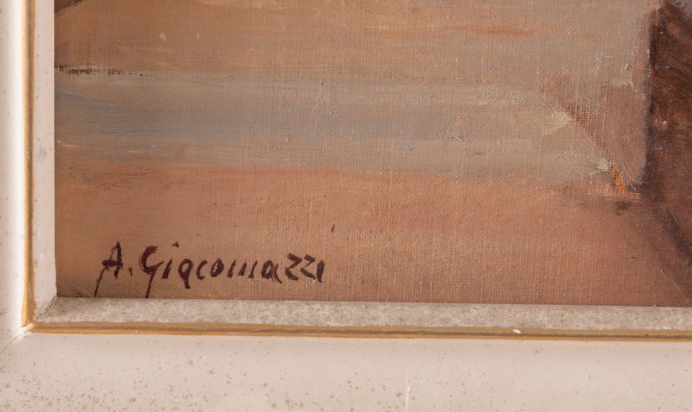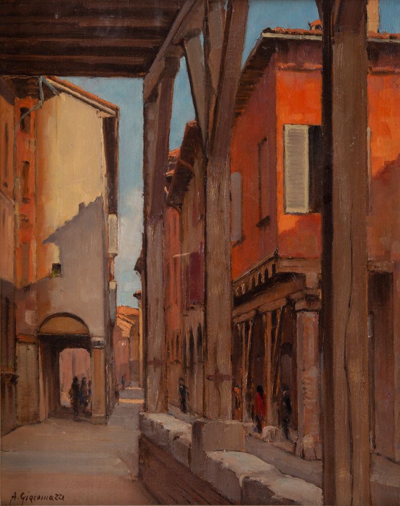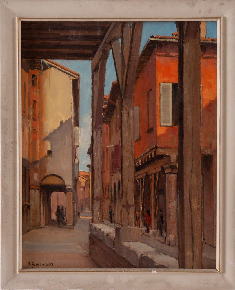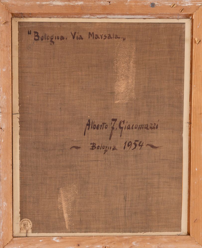 ALBERTO GIACOMAZZI (Venezia 1890 - Bologna 1969) "Bologna, Via Marsala", 1954. Olio su cartone telato. Cm 50x40. Opera firmata in basso a sinistra A. Giacomazzi. Al retro opera intitolata, firmata e datata Bologna Via Marsala, Alberto F. Giacomazzi, 1954.