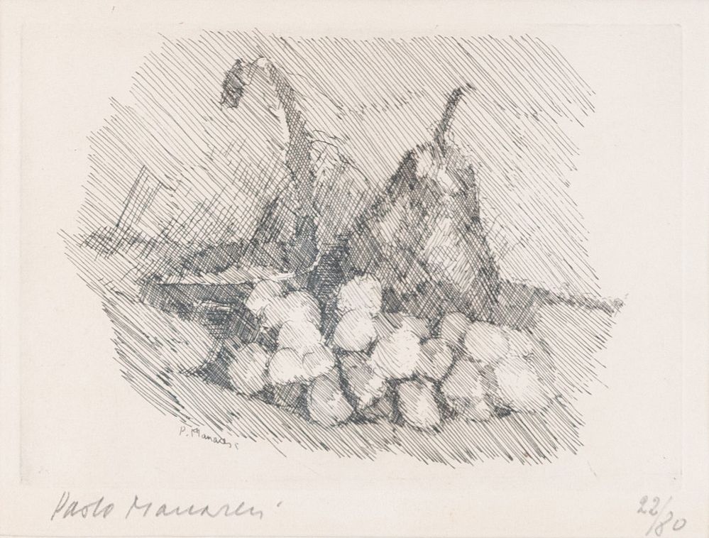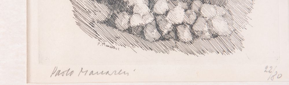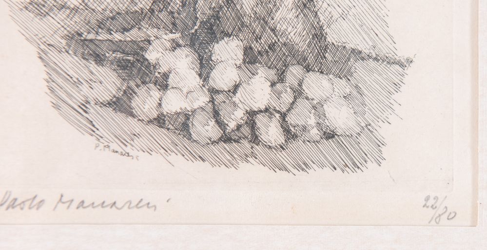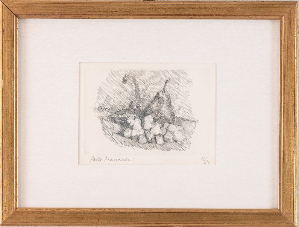 PAOLO MANARESI (Bologna 1908 - 1991) "Natura morta". Acquaforte su carta. Opera firmata sulla lastra in basso a sinistra P. Manaresi. Opera firmata in basso a sinistra Paolo Manaresi. Reca numeri di tiratura in basso a destra 22/80.