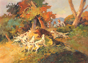 DOMENICI Carlo (Livorno, 1898 - Portoferraio, 1981) Caccia al cinghiale olio su tavola, cm. 50 x 70 Provenienza della Galleria d'Arte Pontevecchio, Firenze Firma 'C. Domenici' (in basso a destra) #Firma, titolo 'Carlo Domenici, Caccia al cinghiale' (al retro)