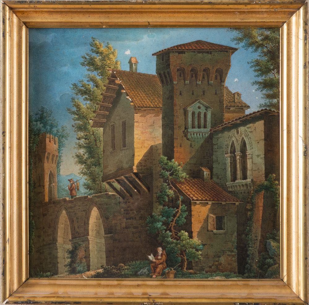 Maestro del XIX secolo. “Architettura con figure”. Acquerello su carta. Cm 35,5x35,5.
