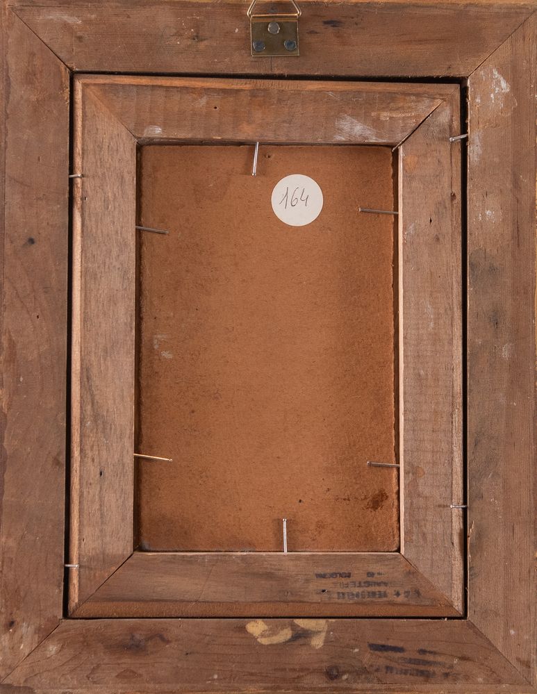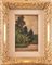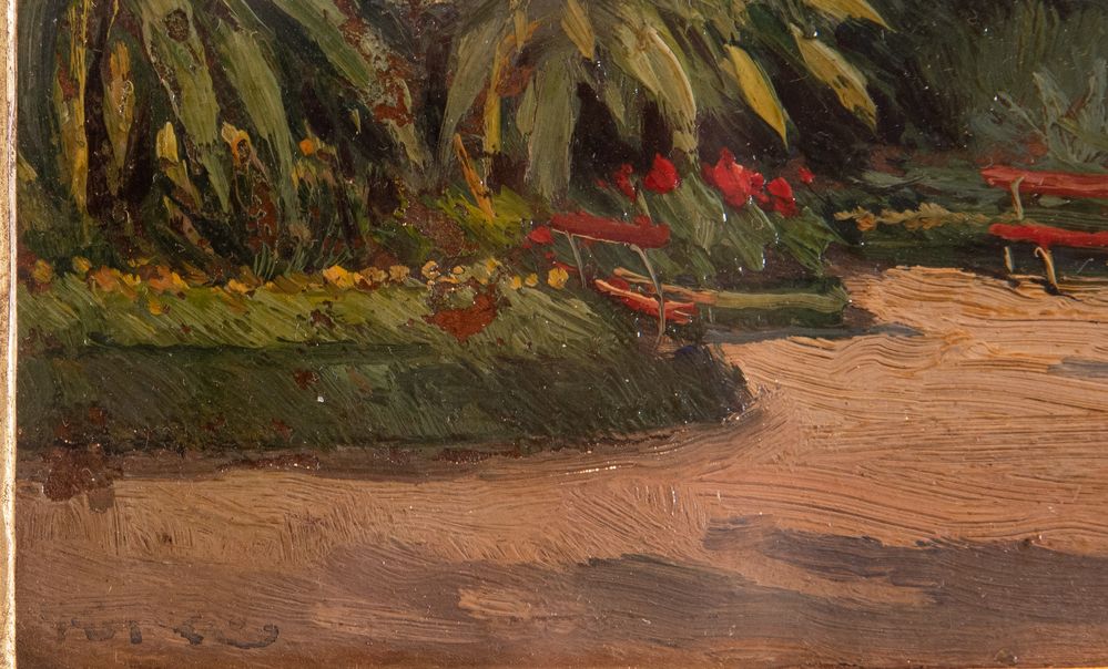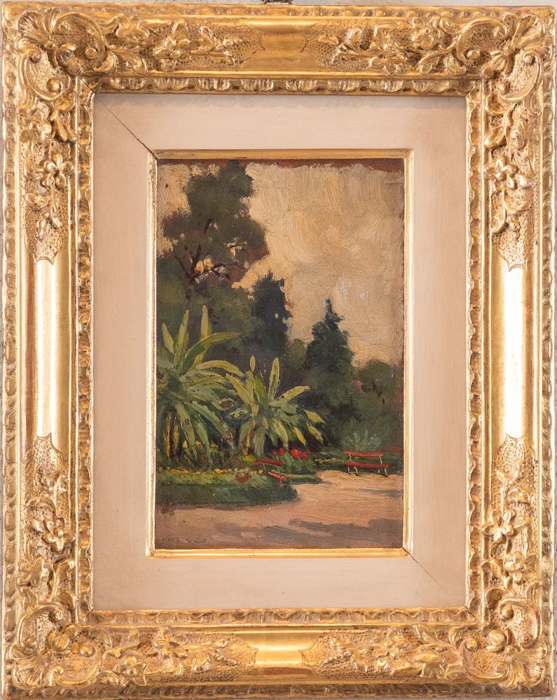Pittore anonimo del XX secolo. "Scorcio di parco". Olio su faesite. Cm 17,4x11. Opera incorniciata da cornice Federicci. Reca firma non decifrata in basso a sinistra.