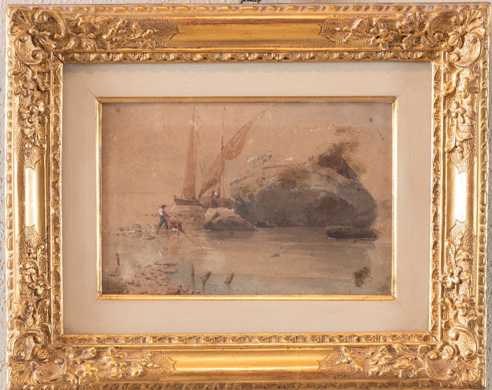 Pittore anonimo del XX secolo. "Pescatori". Acquerello su cartoncino. Cm 13x19. Opera incorniciata da cornice Federicci. Reca firma non decifrata in basso a sinistra.