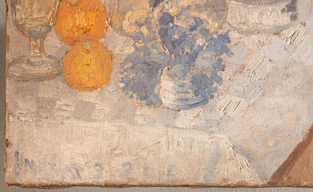 Pittore anonimo del XX secolo "Natura Morta", 1915. Olio su tela. Cm 48x64,5. Opera firmata e datata in basso a sinistra con firma indecifrata 915