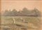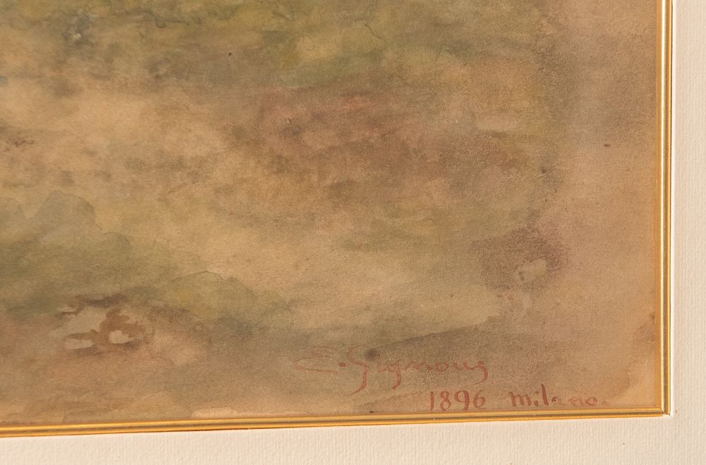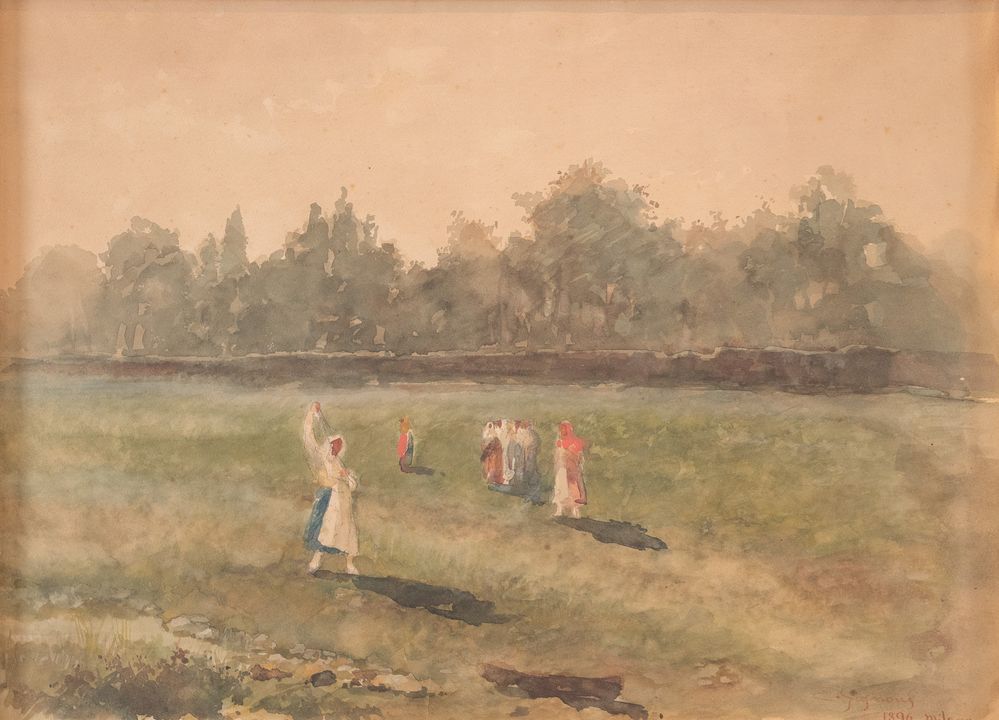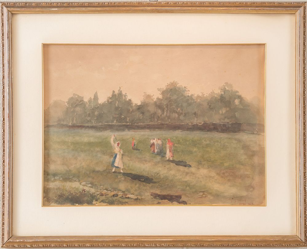 E. GIGNONI "Paesaggio con figure nei campi", 1896. Acquerello su carta. Cm 34x46,5. Opera firmata e datata in basso a destra E. Gignoni 1896, Milano