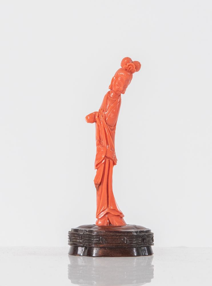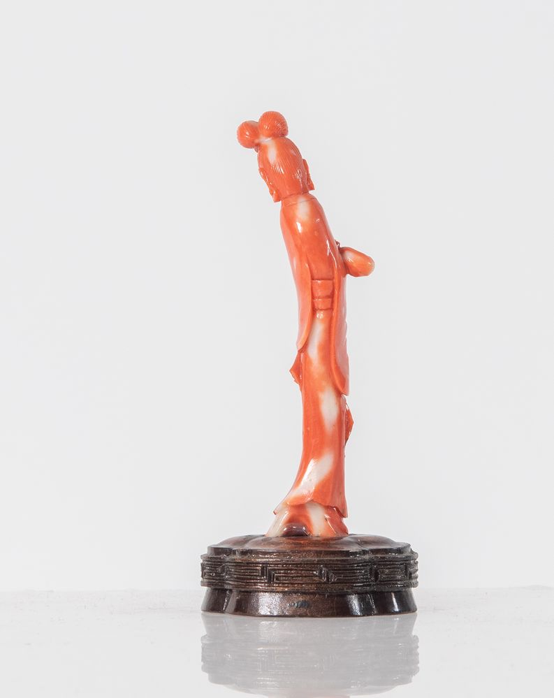 Scultura in corallo Momo o Cerasuolo (Coralium Elatius) raffigurante una Geisha poggiante su base in legno. Corallo di mm 97x30.