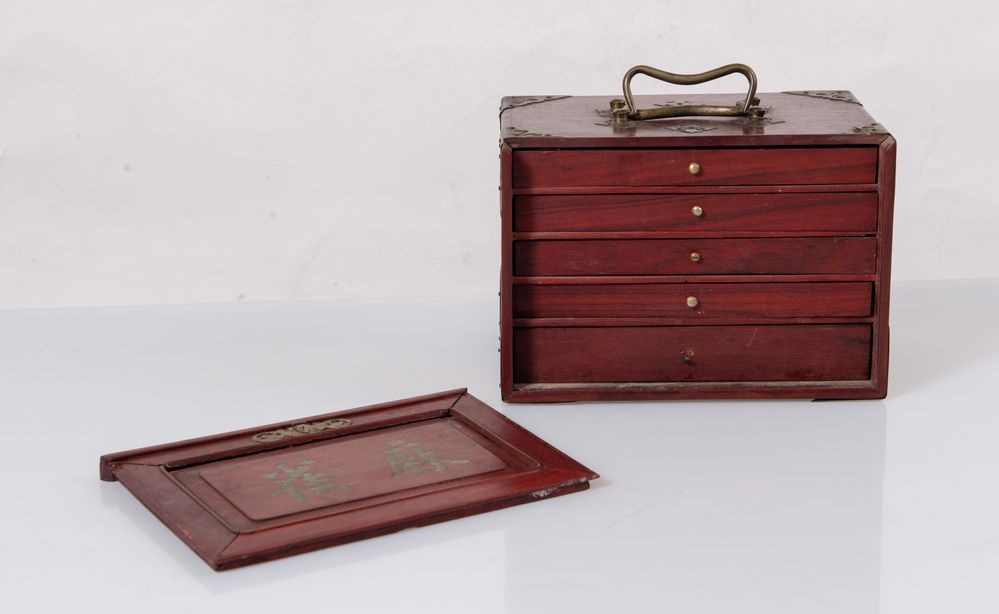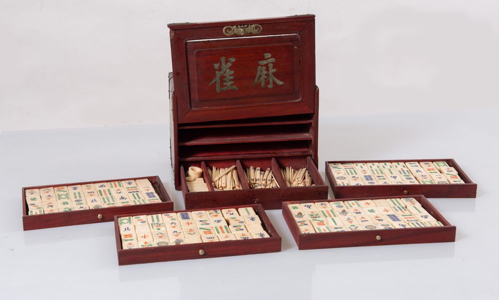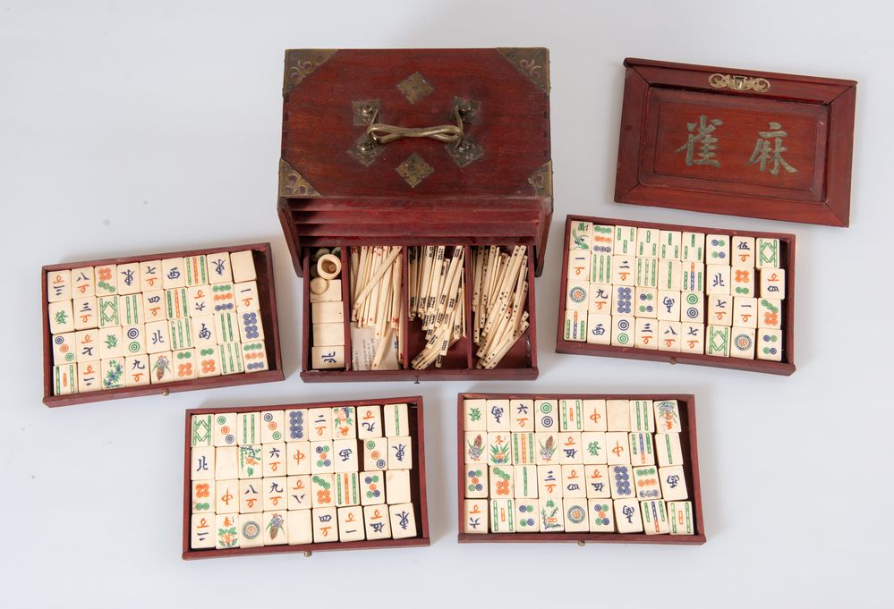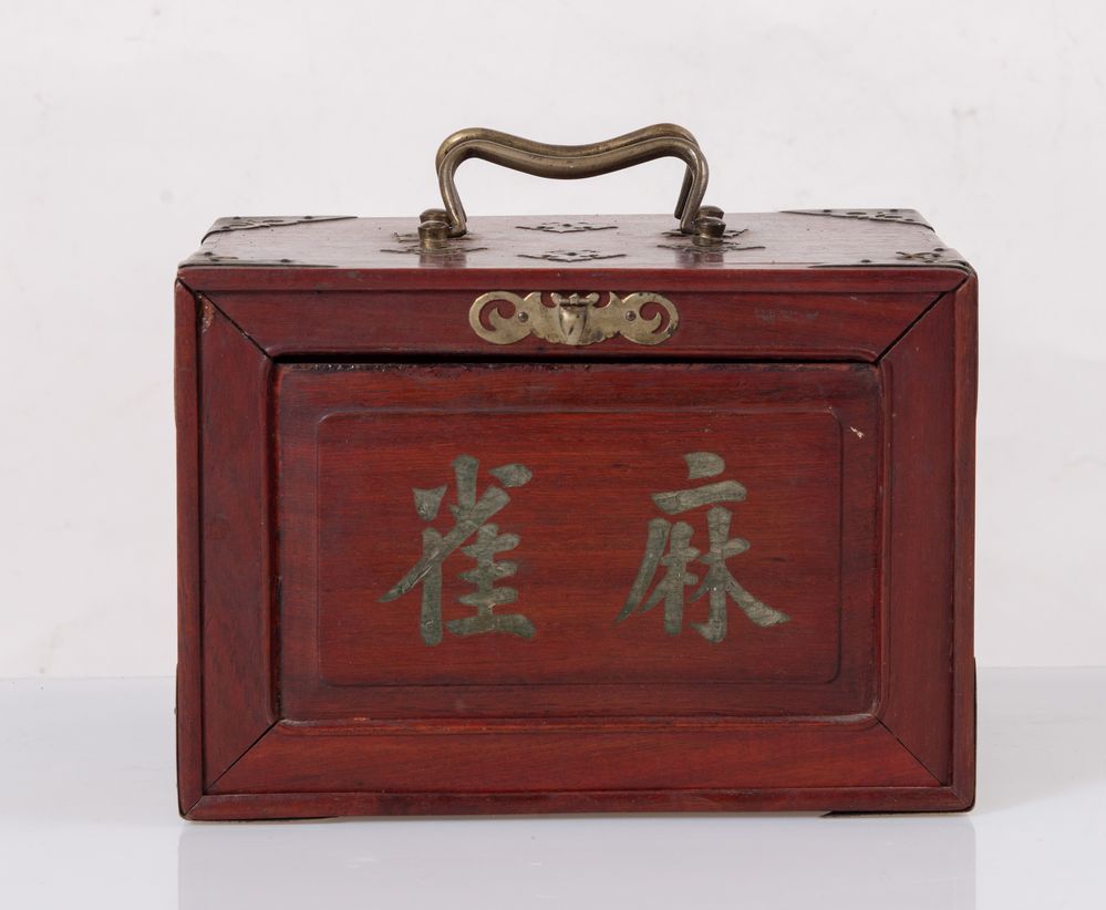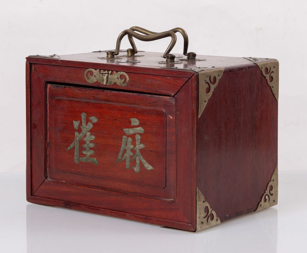 Scatola contenente gioco del MAH JONG in legno con applicazioni in bronzo. Pedine in legno di bamboo e materiale prezioso. Cina, XIX secolo - XX secolo. Cm 17x24x16.