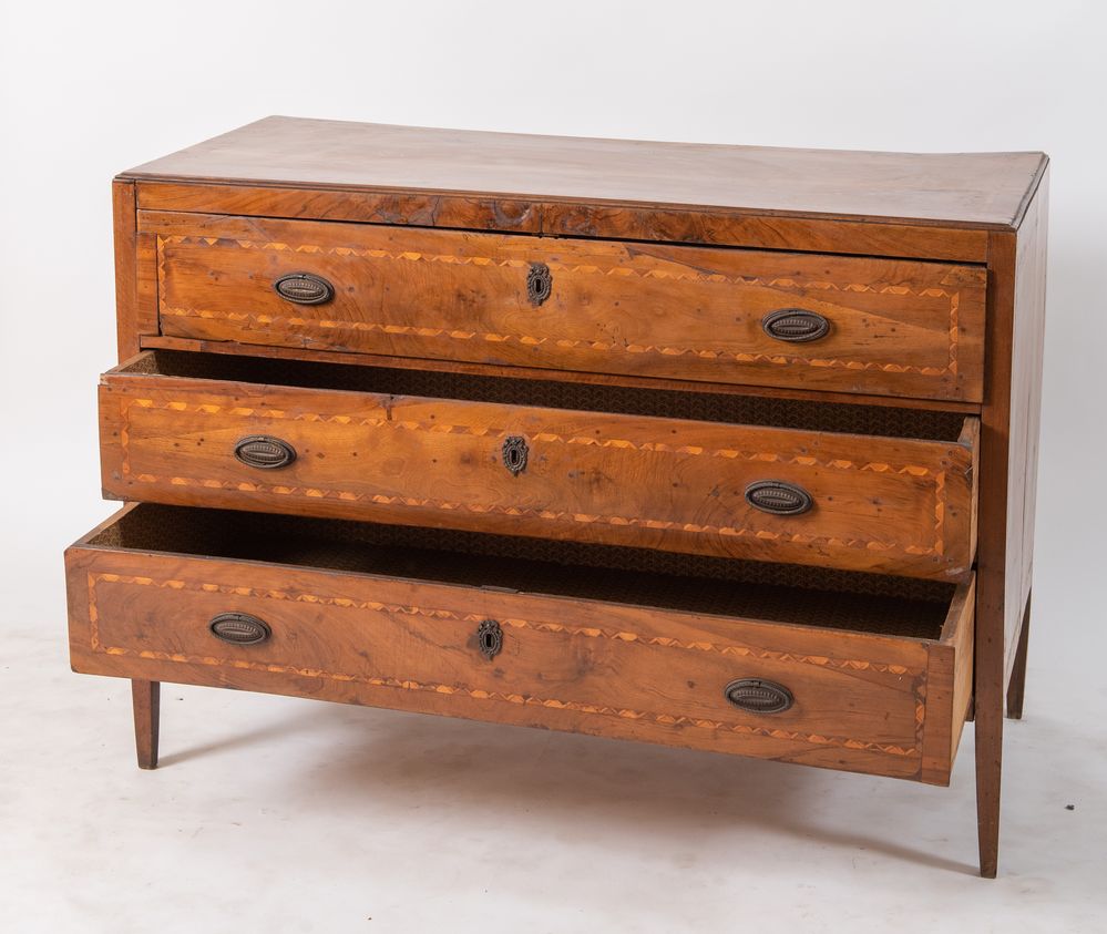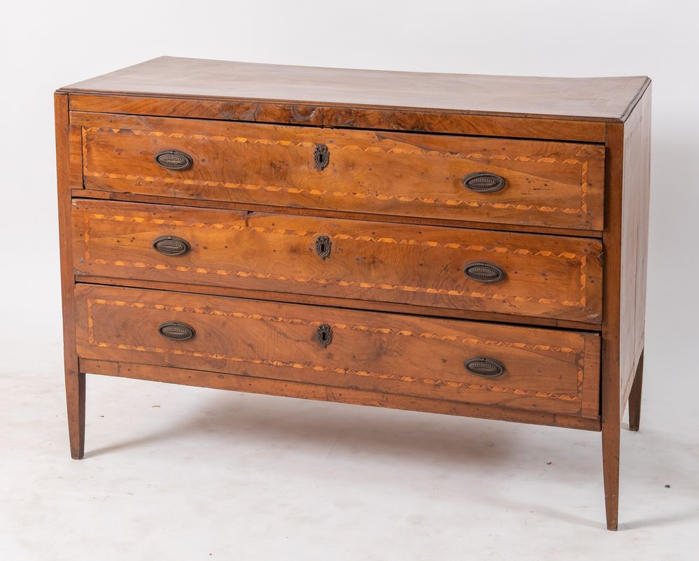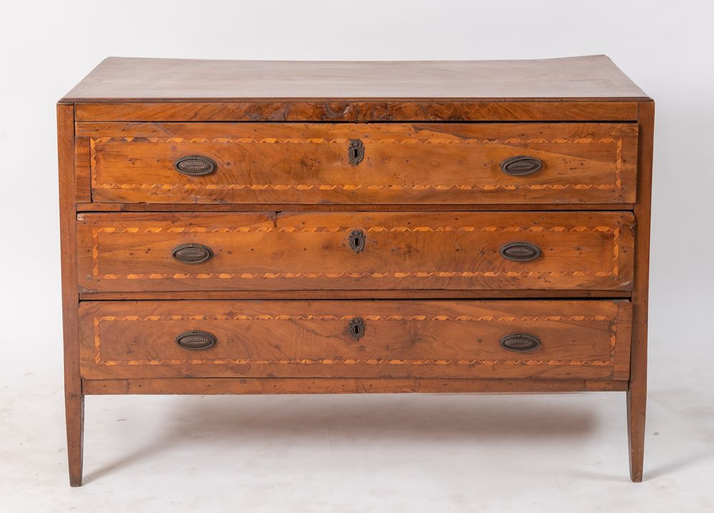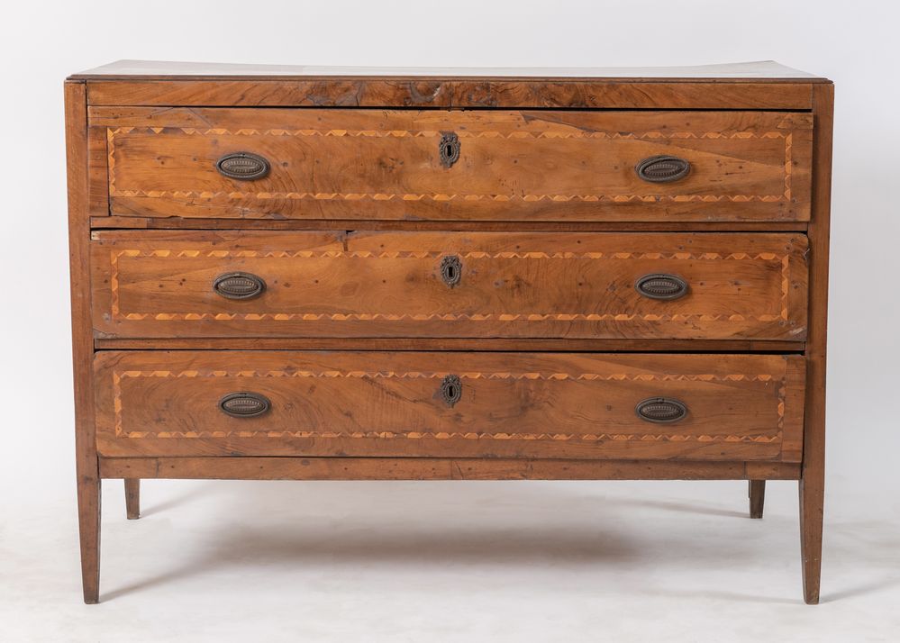Cassettone in massello di noce con intarsi in acero e ciliegio. Veneto, fine del XVIII - inizi del XIX, periodo del Direttorio. Cm 93,4x130,4x58,5.