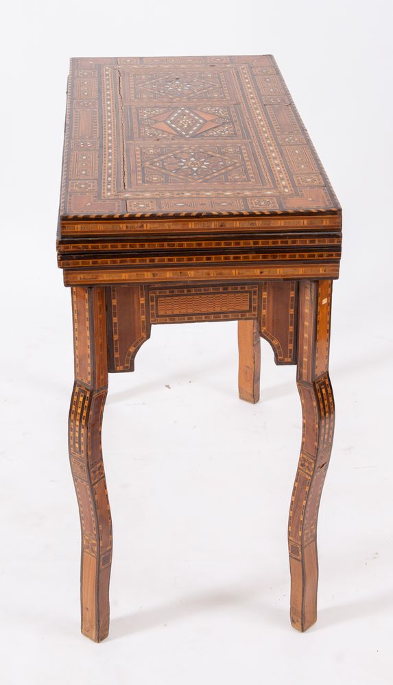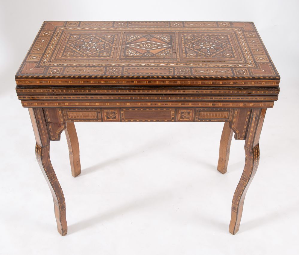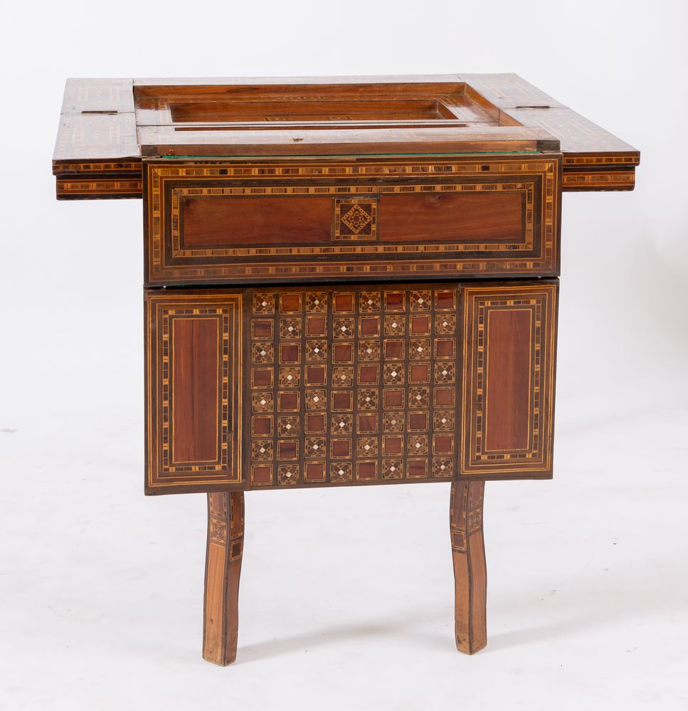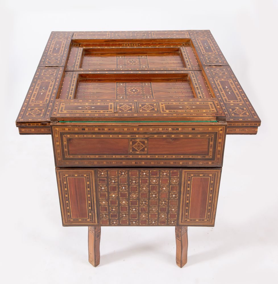 Tavolino da gioco, intarsiato in essenze pregiate e madreperla con motivi geometrici. Cela all'interno vari piani di gioco. Siria, fine del XIX secolo - inizi del XX secolo. Cm 82x84x44 (chiuso). Cm 82x84x85 (aperto).
