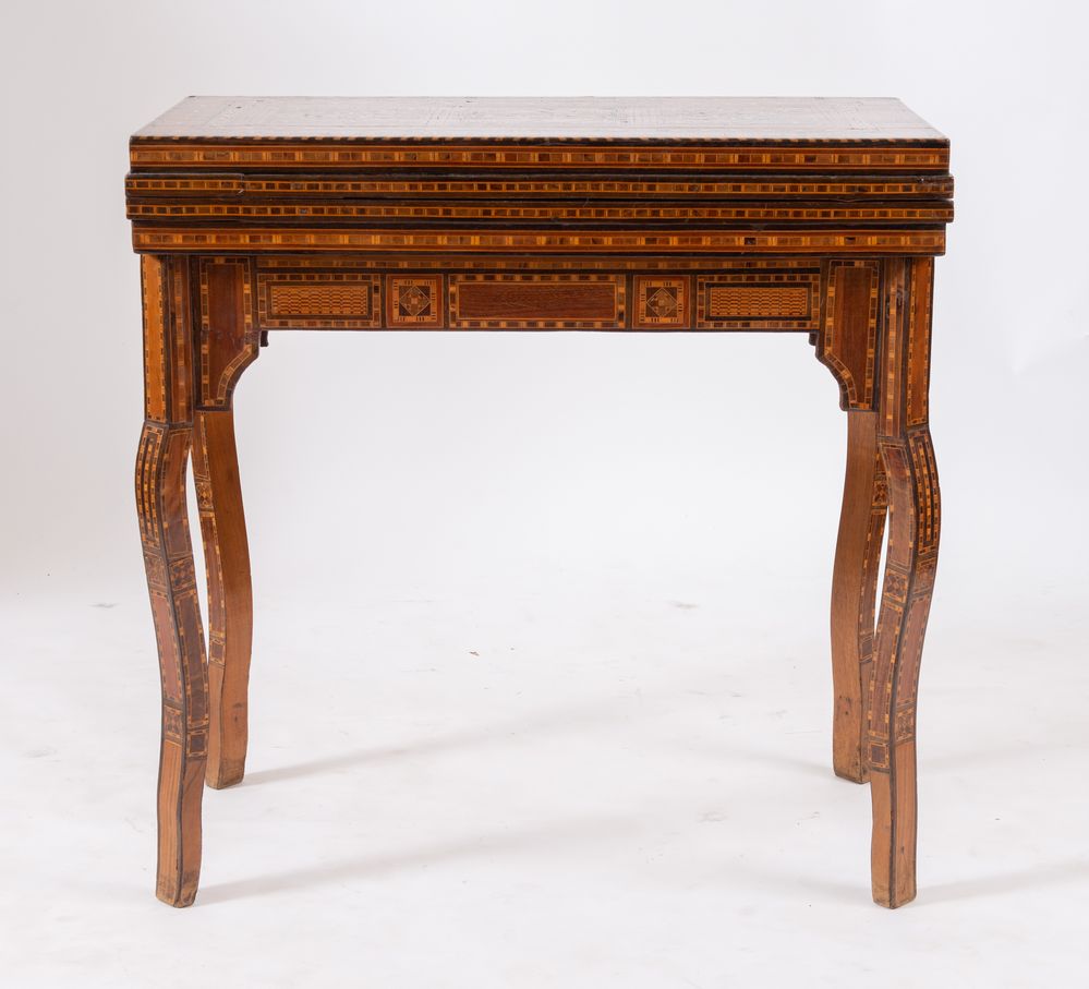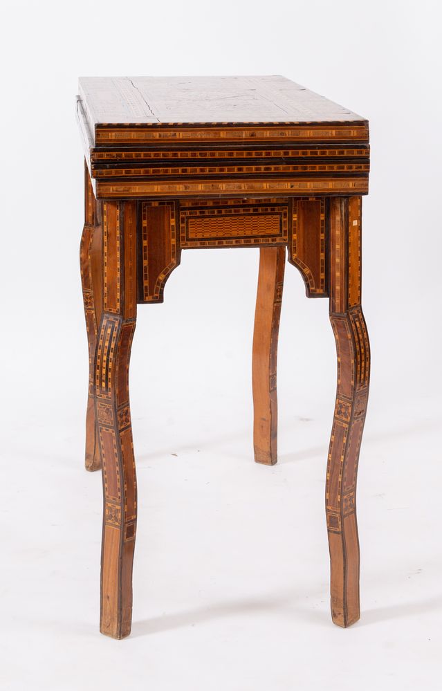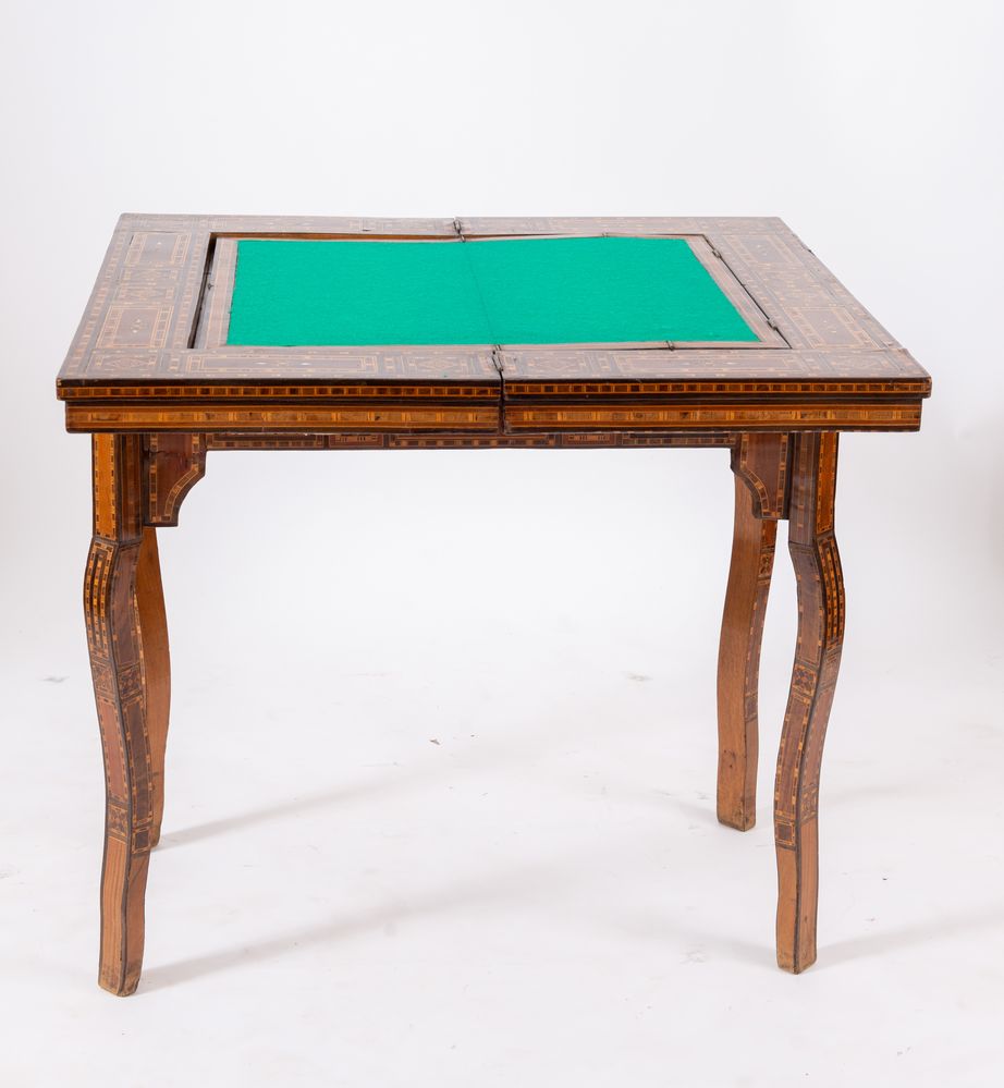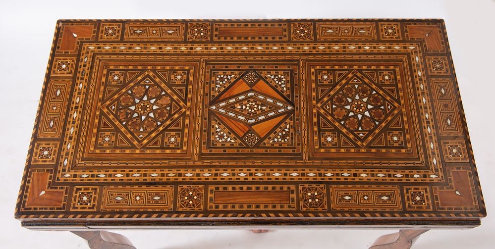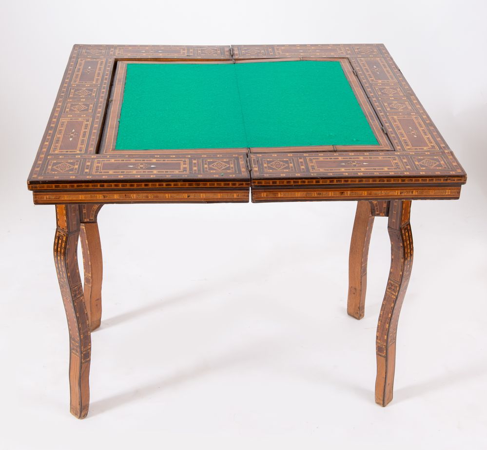 Tavolino da gioco, intarsiato in essenze pregiate e madreperla con motivi geometrici. Cela all'interno vari piani di gioco. Siria, fine del XIX secolo - inizi del XX secolo. Cm 82x84x44 (chiuso). Cm 82x84x85 (aperto).