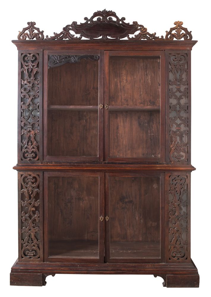 Mobile doppio corpo a vetrina, composto da elementi antichi. Reca lati pilastrati, traforati con motivi fitomorfi. Emilia, XIX secolo. Cm 263x175,5x50.