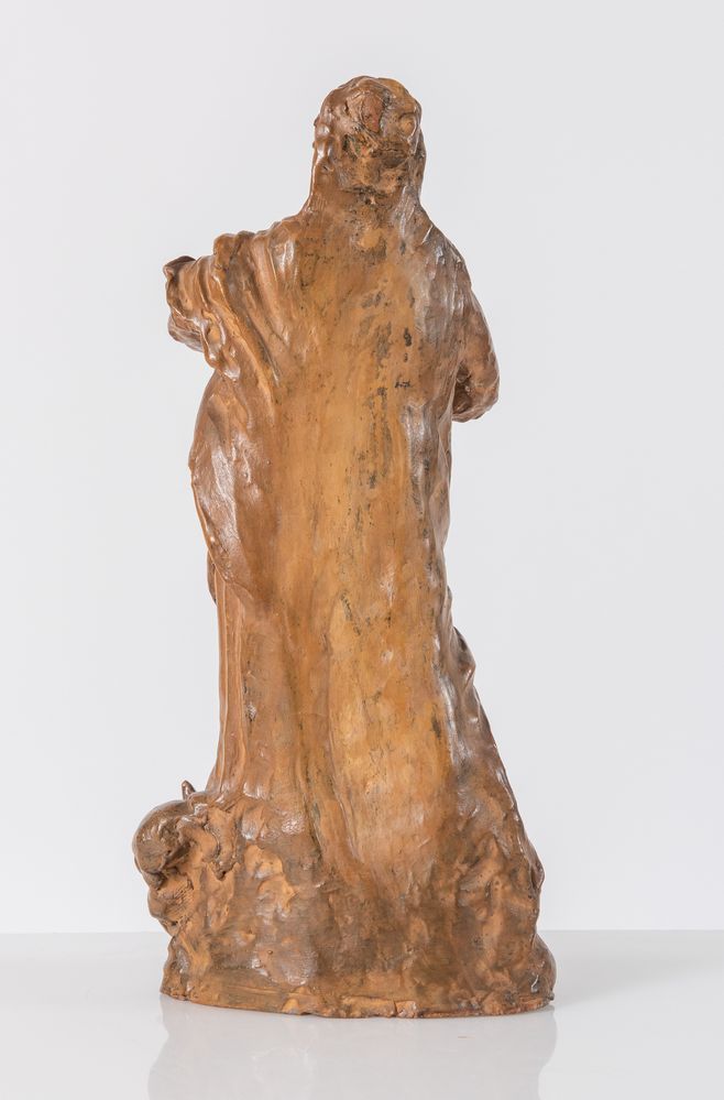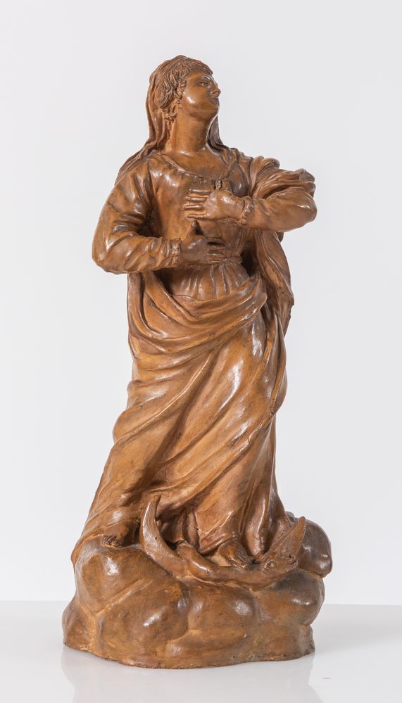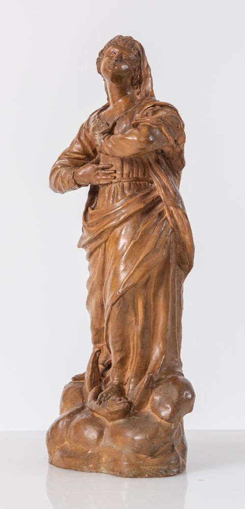 Scultura in terracotta, raffigurante Assunta. Emilia, XVIII secolo. Cm 49x23x15.