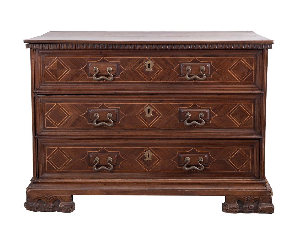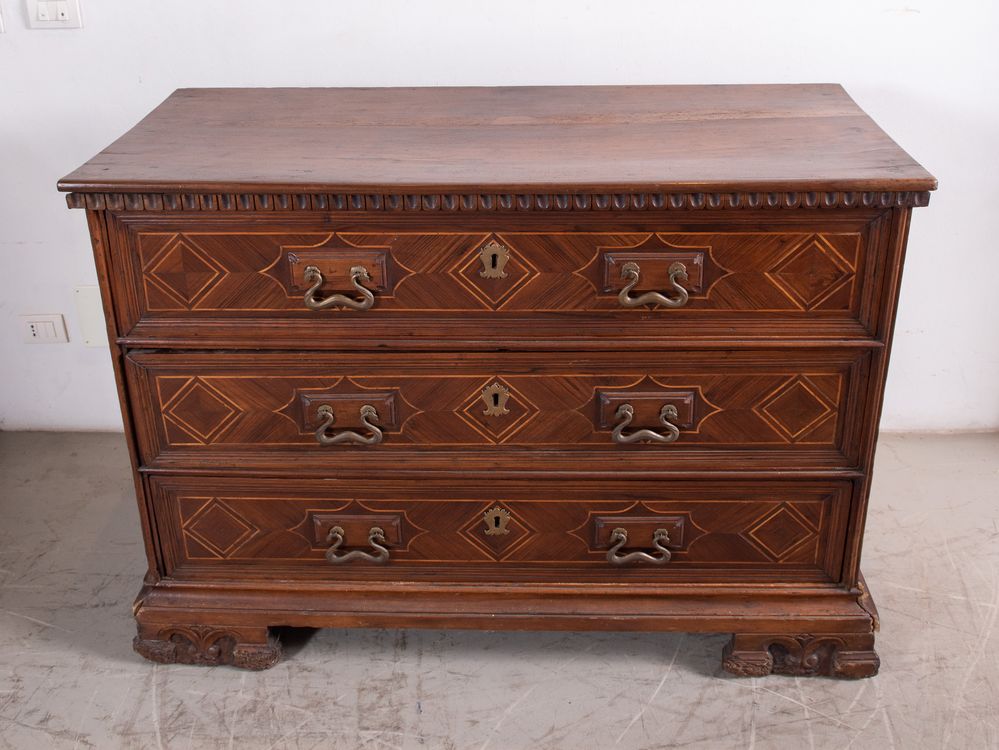 Lot 431 | Canterano in massello di noce. Cassetti spinati e filettature in rigatino e...