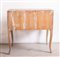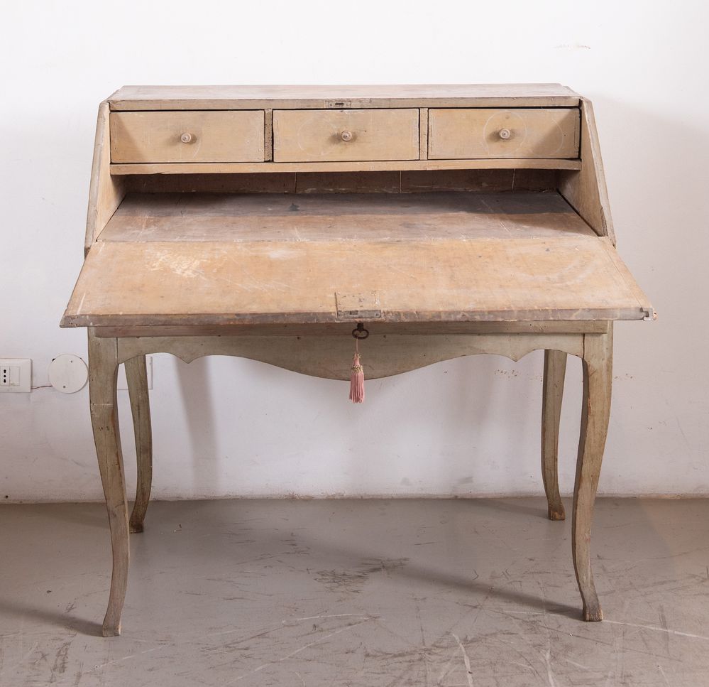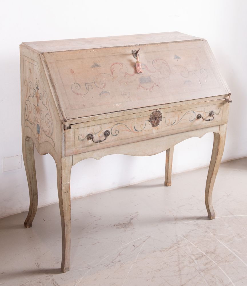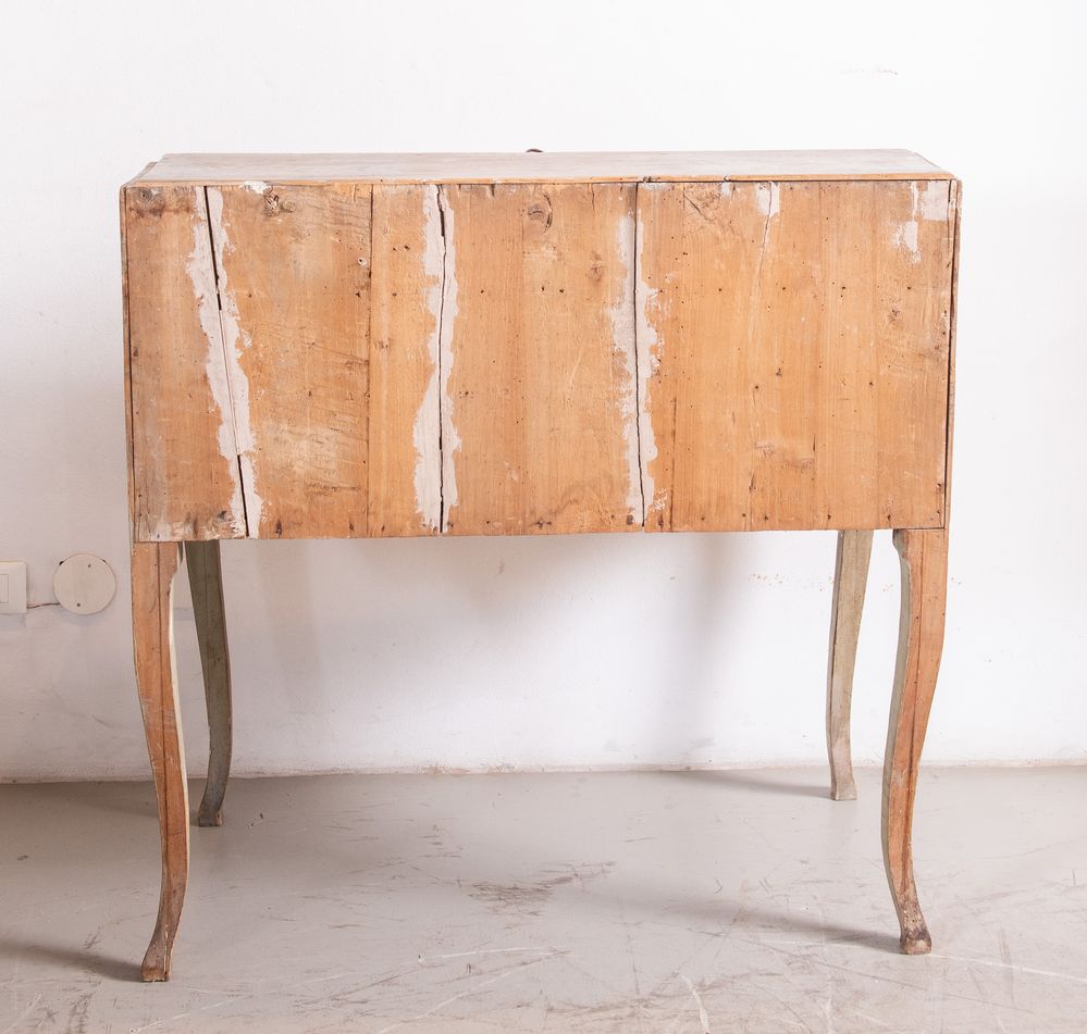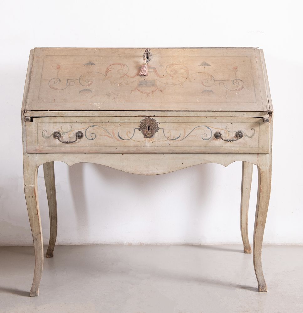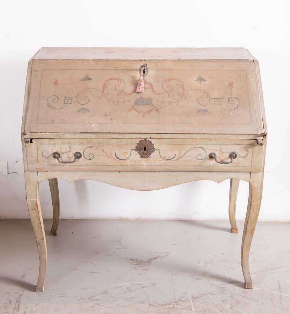 Ribalta in massello di pioppo, laccata e decorata con motivi a grottesche. stile Luigi XV. Marche, metà del XVIII secolo. Cm 102,5x102x50. (difetti)