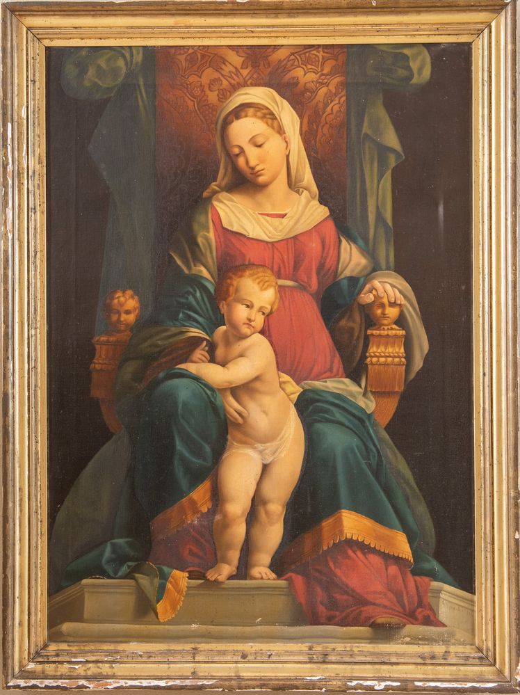 Maestro del XIX Secolo. “Madonna con bambino”. Olio su tela. Cm 90x67. Firmato e datato Spinelli 1841.