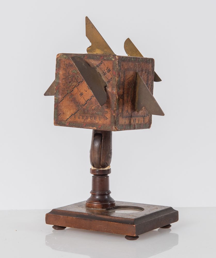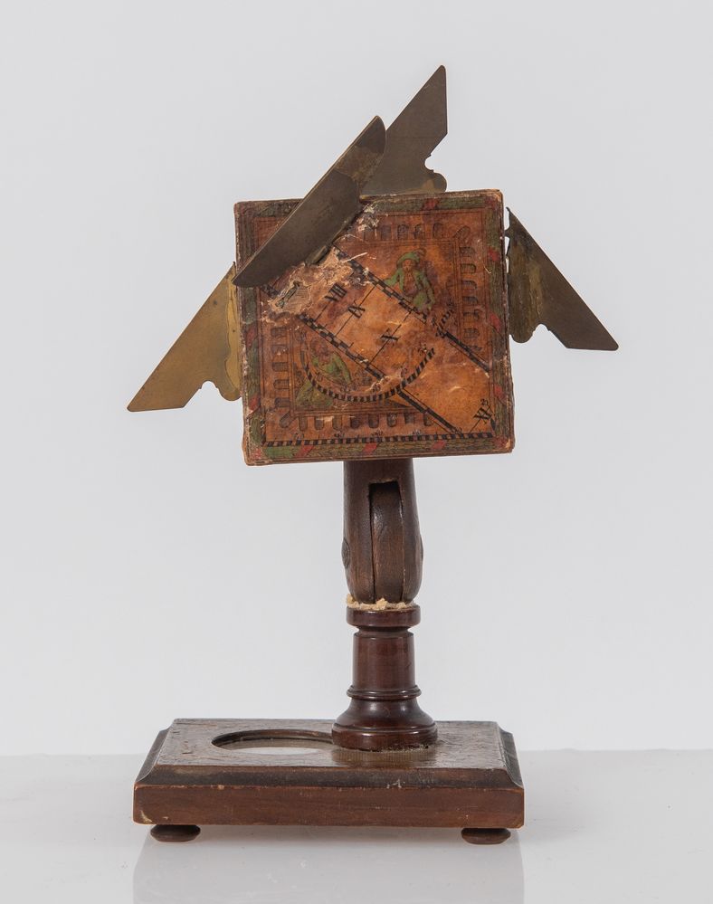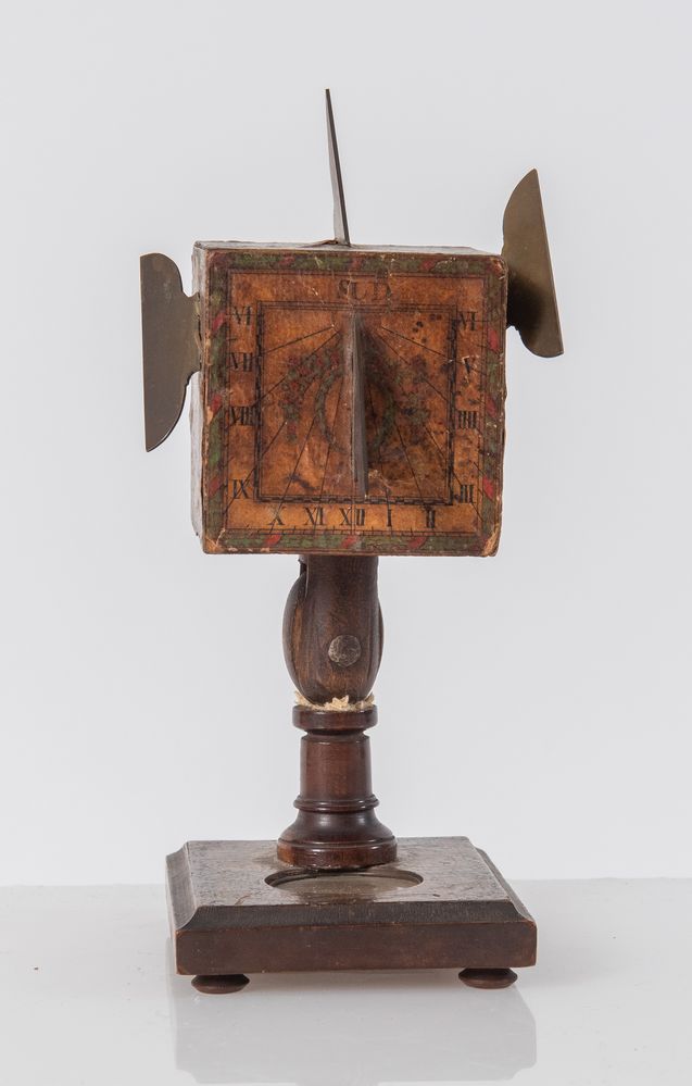Orologio solare in legno con applicazioni in carta. Reca bussola incastonata alla base. Seconda metà del XVIII secolo. Cm 21x8x10. Un esemplare è pubblicato in V. Bassermann-Jordan, Uhren, 1922, pag. 44, tav. 38.