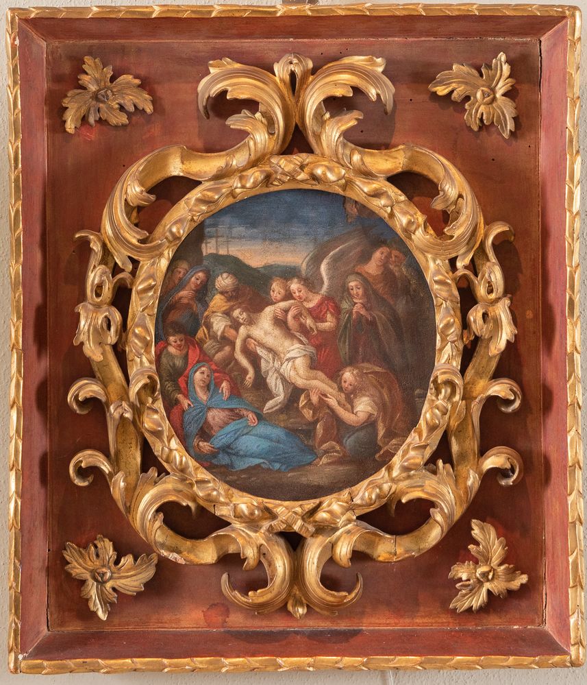 Maestro del XVII secolo. “Deposizione”. Olio su rame. Cm 24x21.