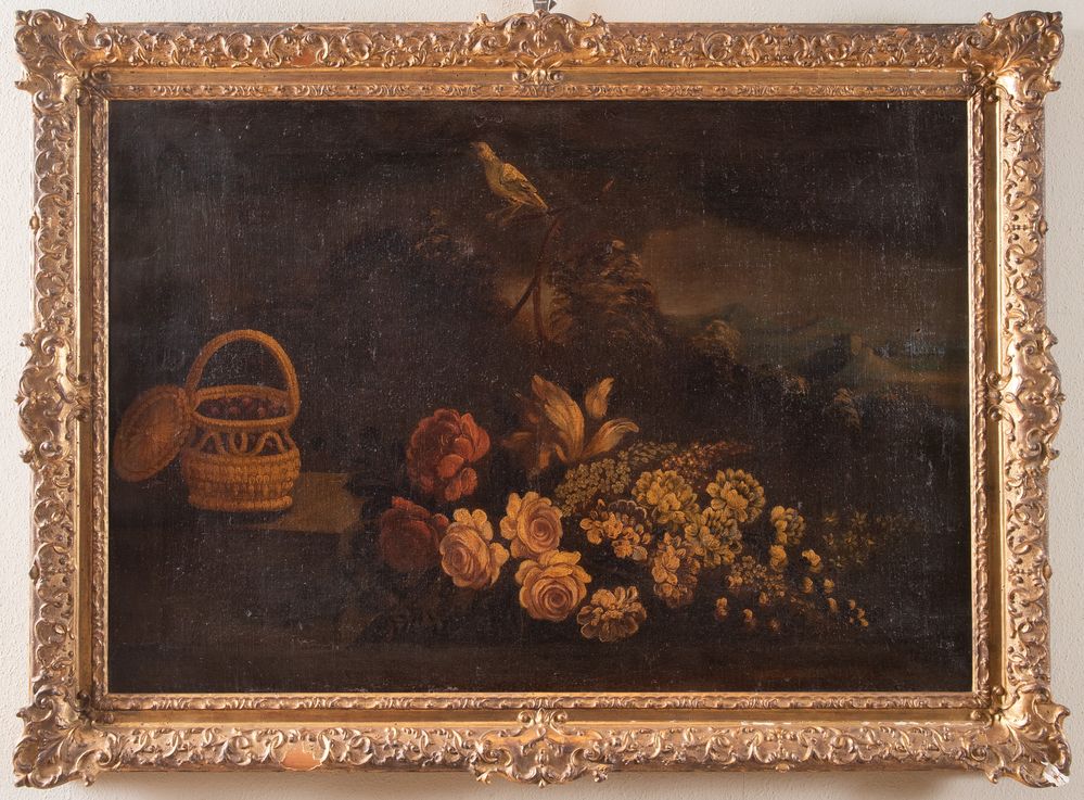 Maestro francese della fine del XVIII secolo - inizi del XIX secolo."Natura morta". Olio su tela. Cm 73,5x105.