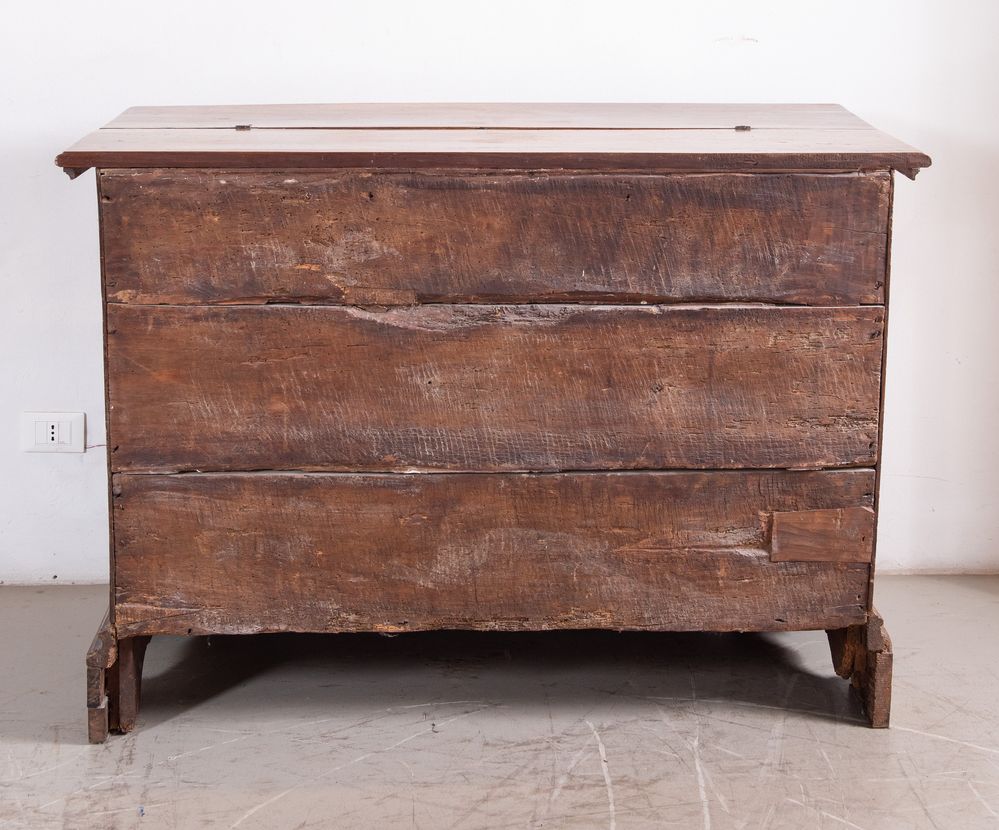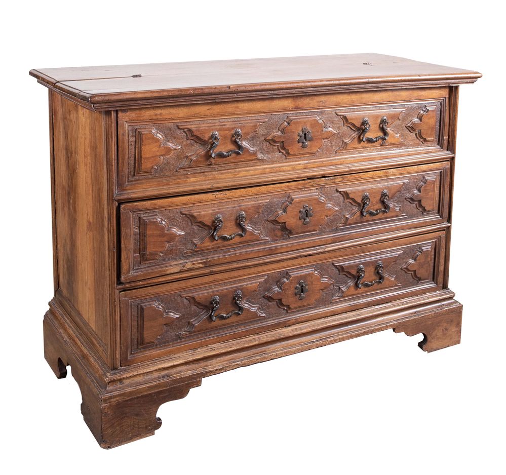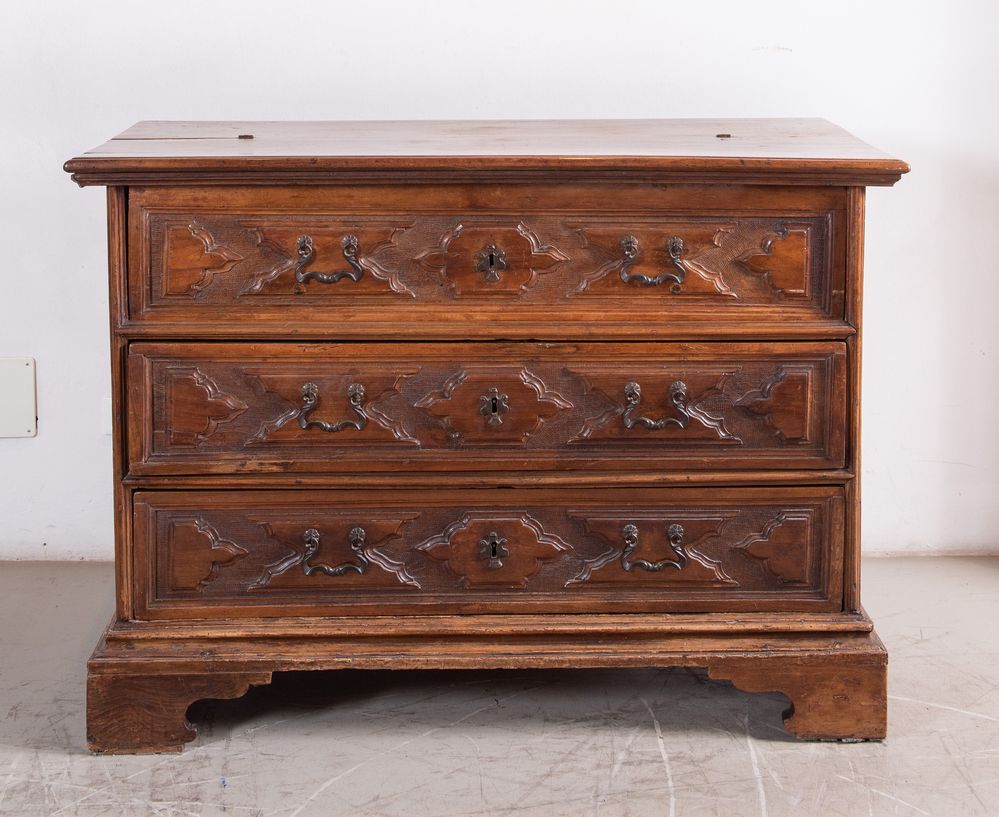 Canterano a ribalta in massello di noce, con fronte formellato e bulinato. Maniglie e bocchette in bronzo coeve. Scarabattolo celante sei cassetti formellati e bulinati anch'essi. Mantova, XVII secolo. Cm 97x137,5x58.