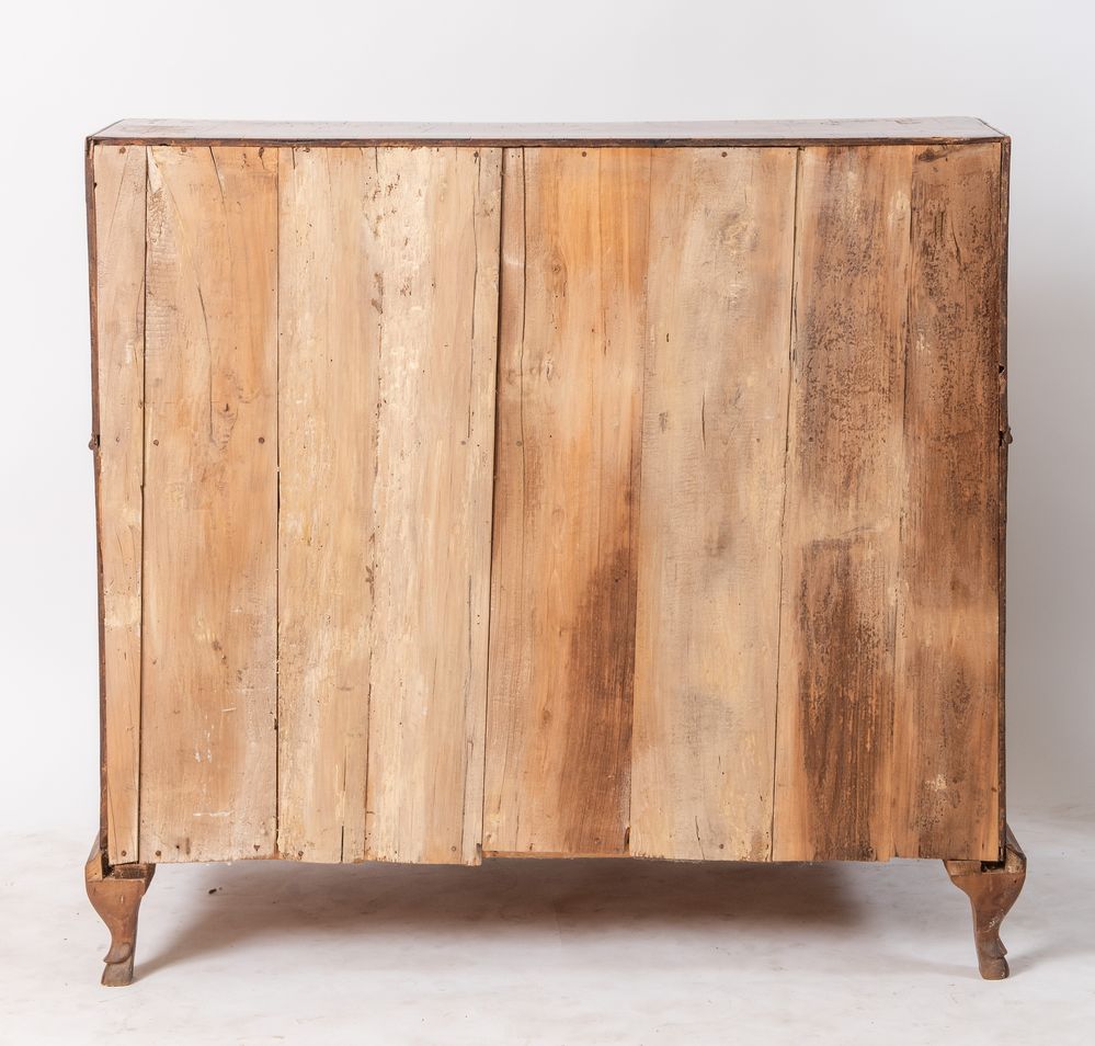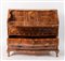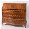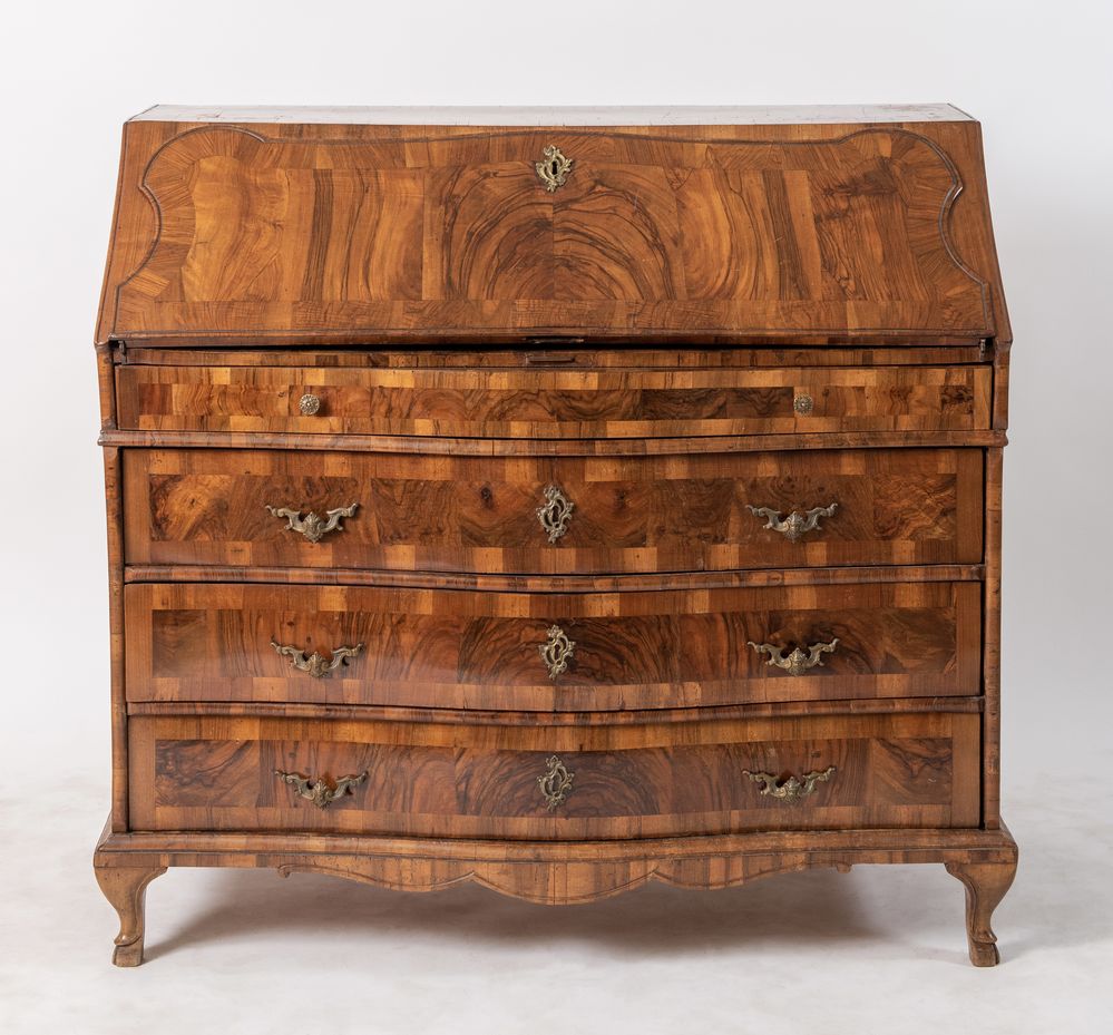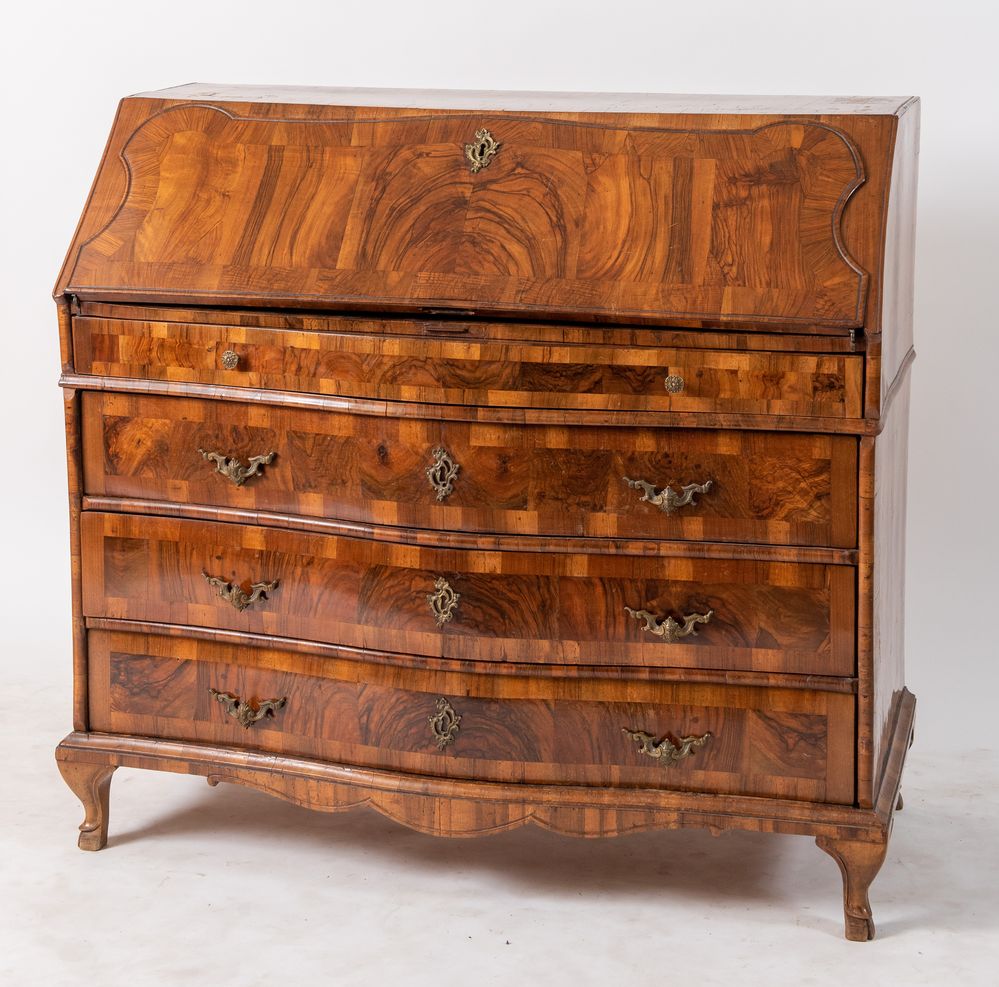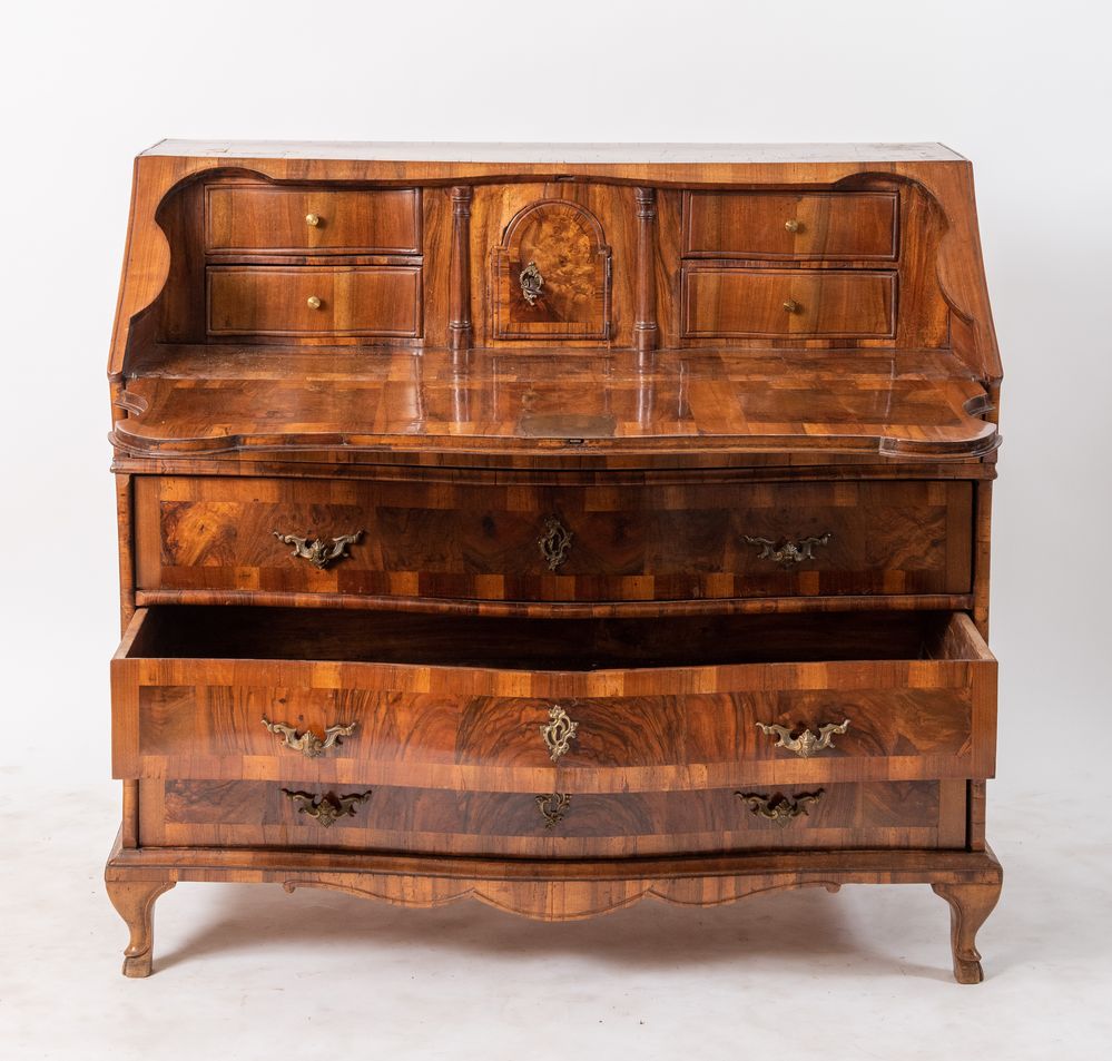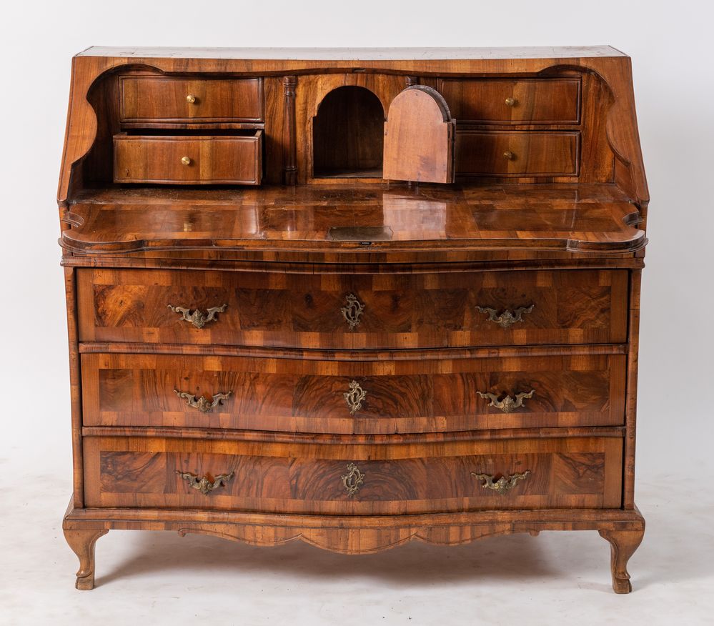 Ribalta lastronata in radica di noce. Fronte leggermente mosso e profilature in legno di testa e scarabattolo celante quattro cassetti e un'antina. Emilia, metà XVIII secolo. Cm 115x125x58. (difetti e modifiche)
