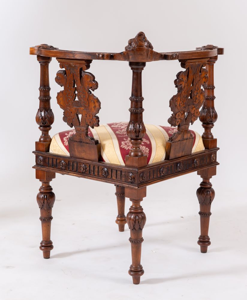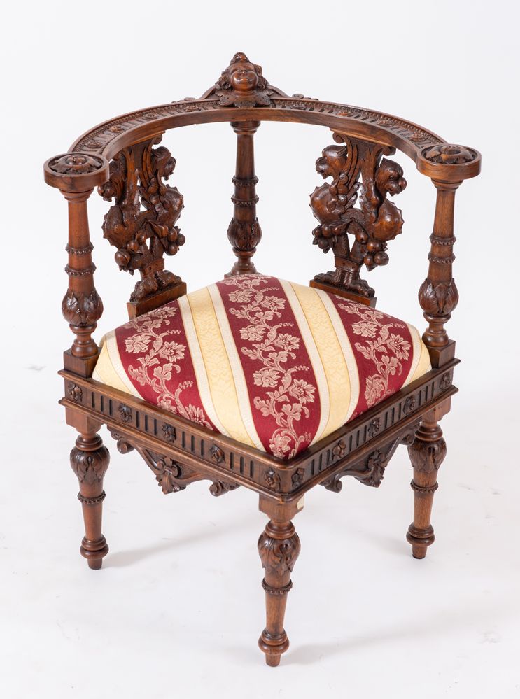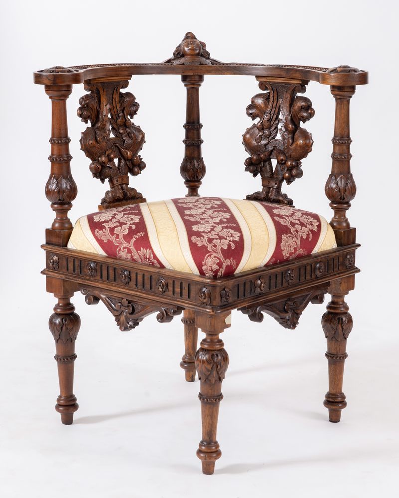 Fratelli Besarel, Venezia, 1750. Poltroncina in legno di noce con schienale intagliato con motivo di draghi. Reca targa 1750. Cm 79x66,2x72.