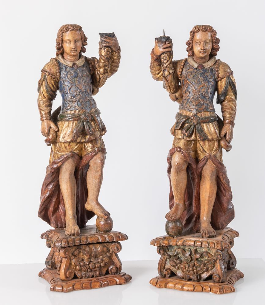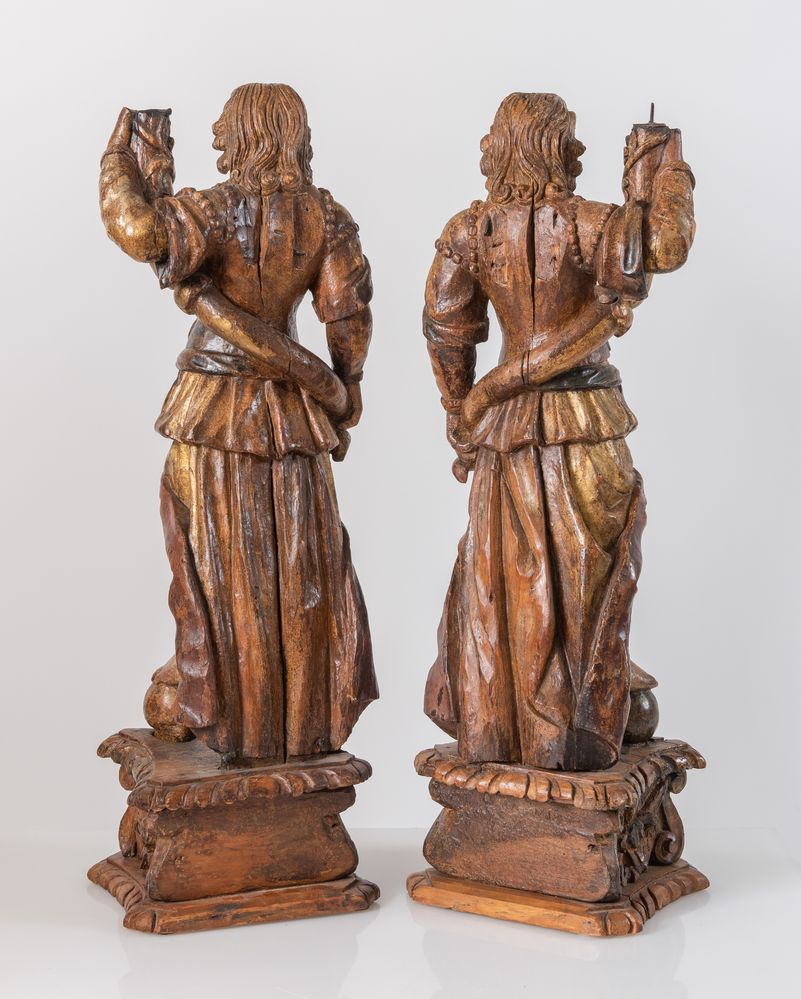 Coppia di angeli reggicero in legno scolpito e placcato. Italia settentrionale, seconda metà del XVII secolo. Cadauno di cm 88x29x24,7.