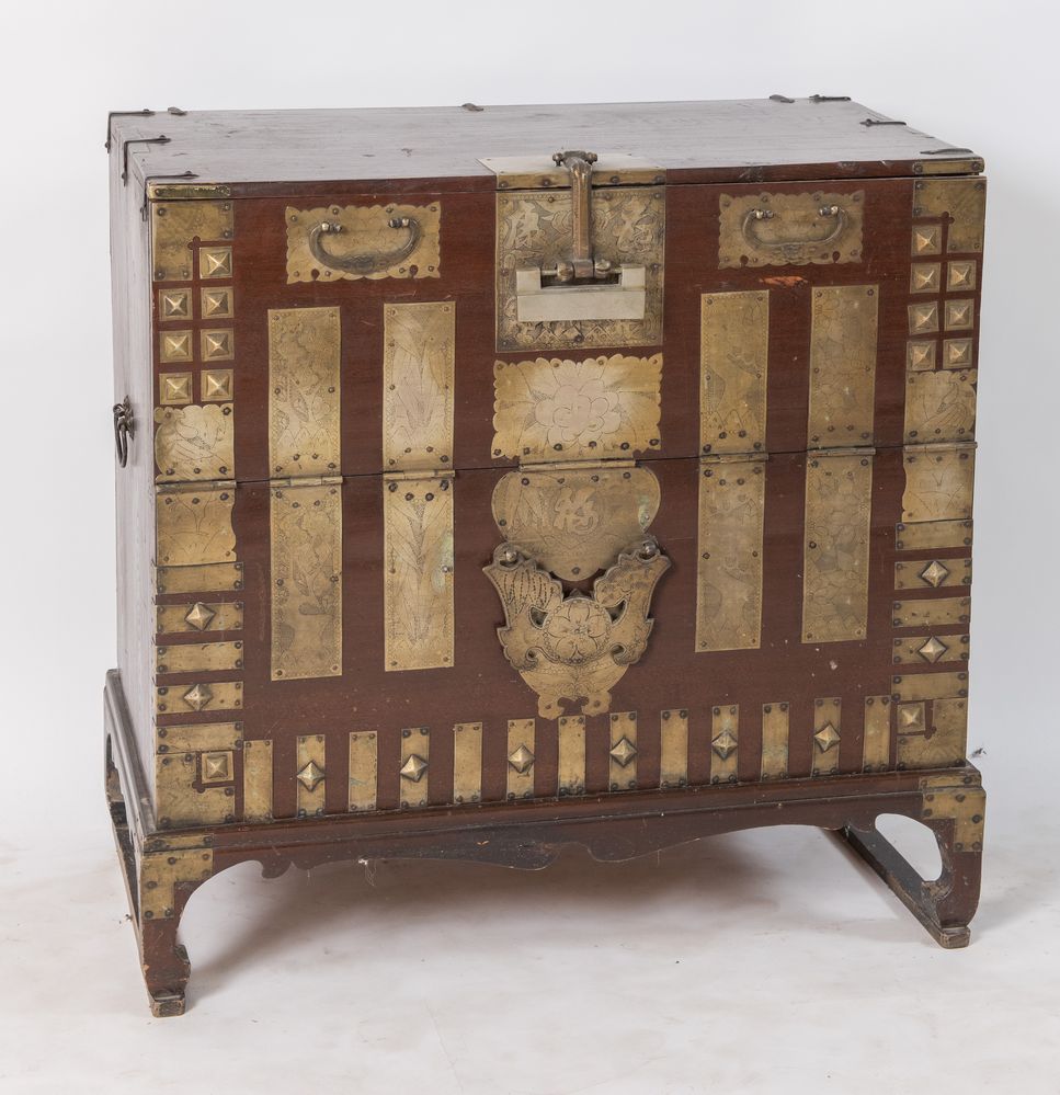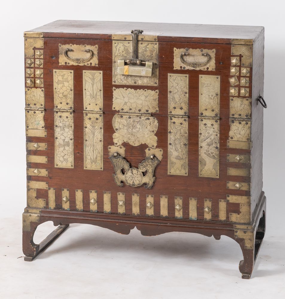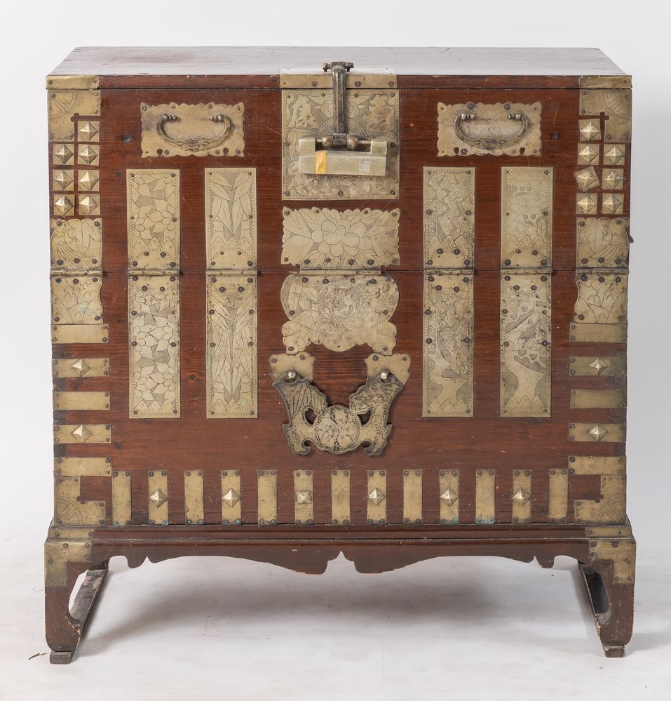 Coppia di mobili contenitori in abete con applicazioni in bronzo argentato. Arte orientale, XVII/XIX secolo. Rispettivamente di cm 94x91,5x43,5 e 89x90,5x50.