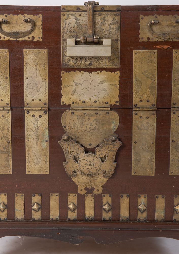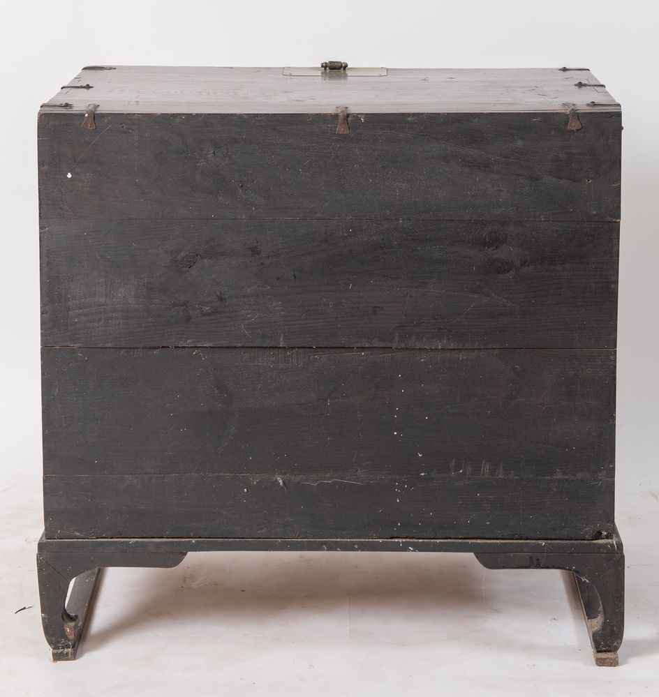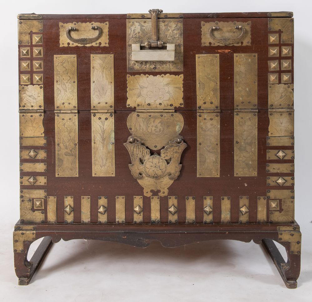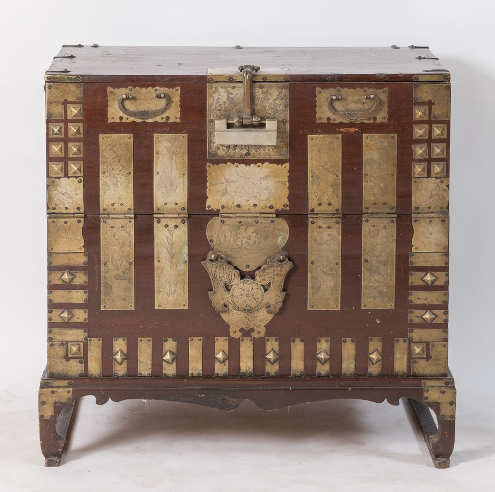 Coppia di mobili contenitori in abete con applicazioni in bronzo argentato. Arte orientale, XVII/XIX secolo. Rispettivamente di cm 94x91,5x43,5 e 89x90,5x50.