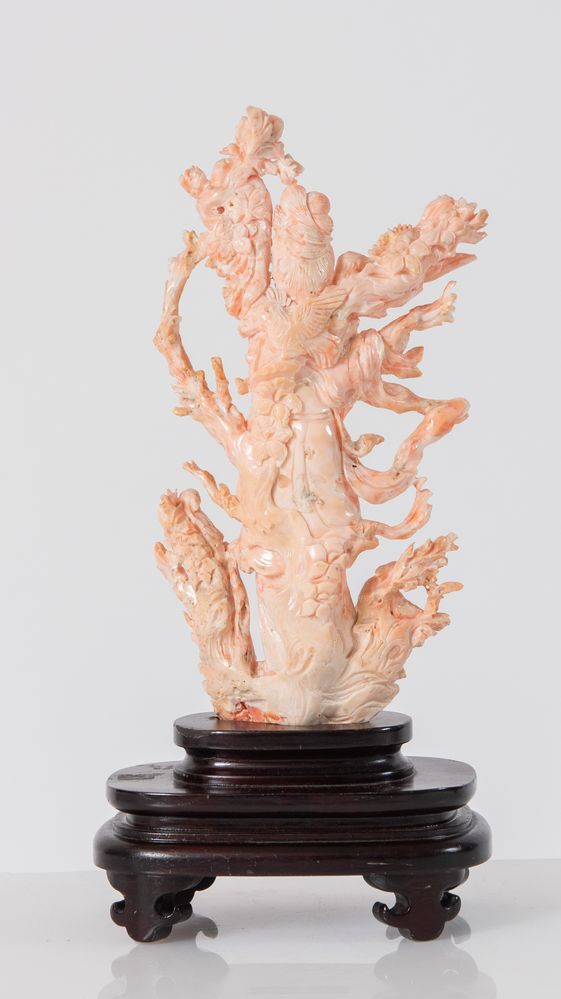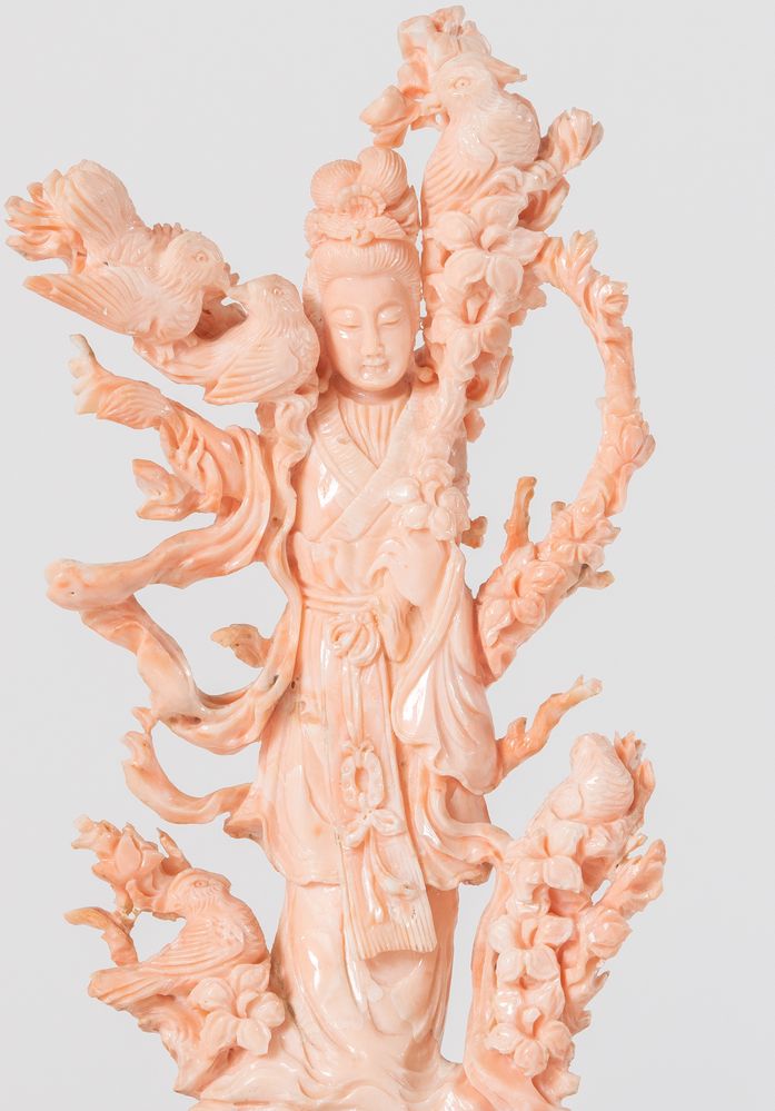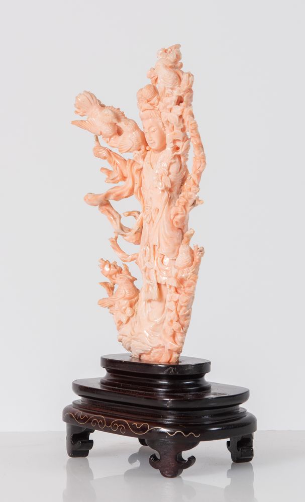 Grande scultura in corallo Bokè o Pelle d'Angelo (Corallium Secundum) raffigurante una Geisha tra fiori e volatili. Corallo di mm 270x125. Peso della statuetta 668g.