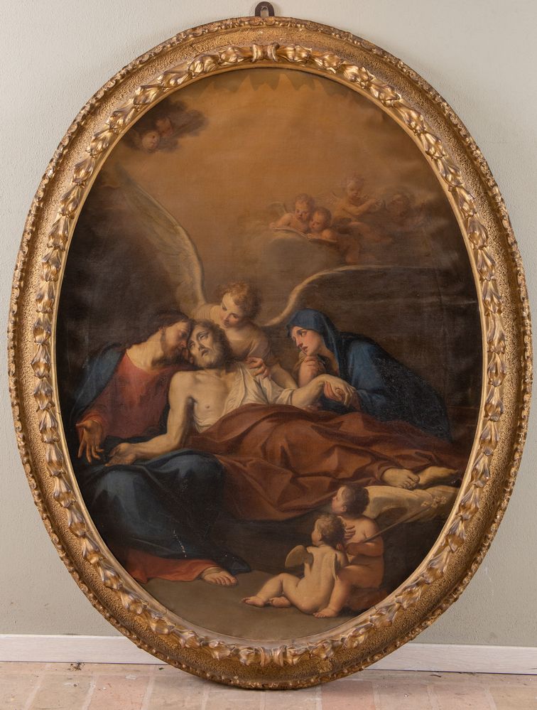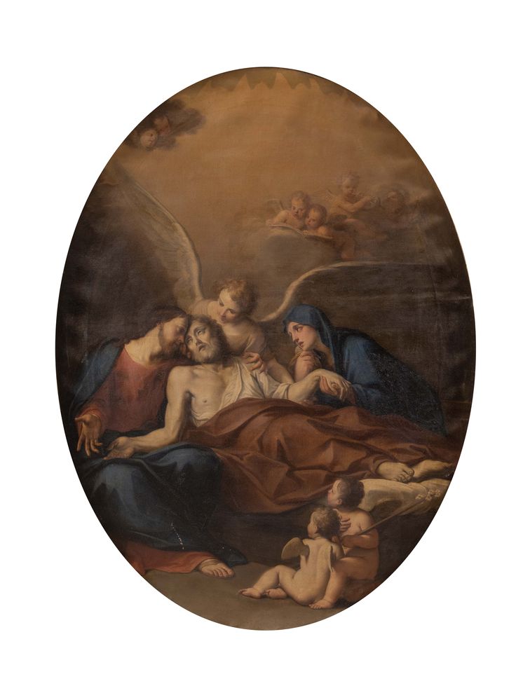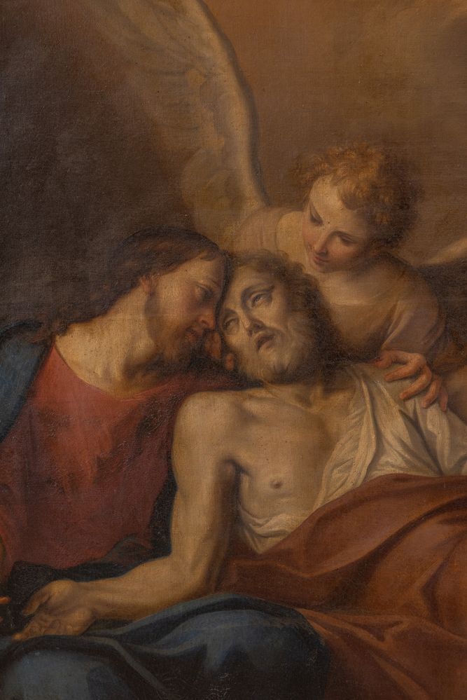 Maestro bolognese del XVII secolo. "Morte di San Giuseppe". Olio su tela. Cm 151x111.