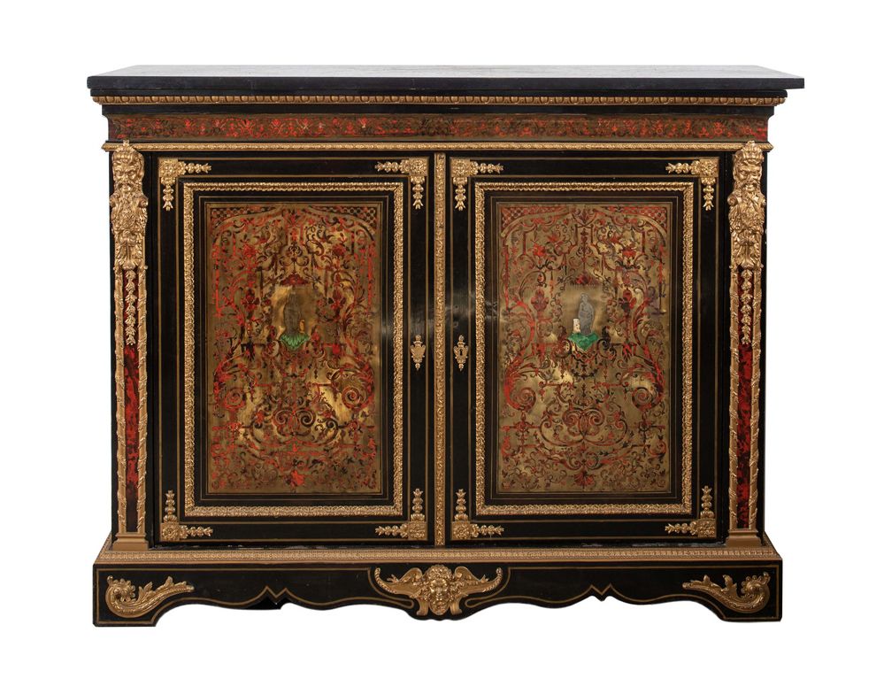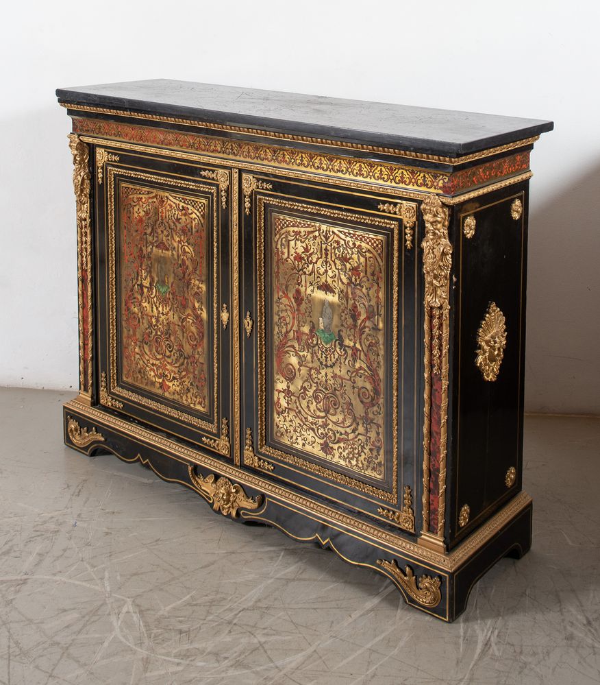 Credenza Napoleone III con intarsi in ottone e similtartaruga, applicazioni in bronzo dorato su fondo di legno ebanizzato. Piano in marmo nero del Belgio. Francia, fine del XIX secolo. Cm 111x143x41.