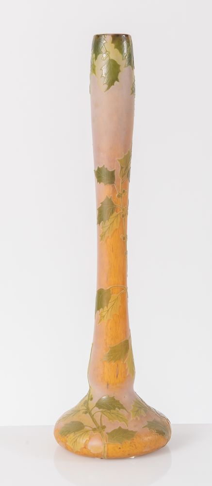 LEGRAS "Grand vase avec houx", 1890/1919. Grande vaso in vetro soffiato cammeo, con collo lungo con decorazione ad agrifoglio inciso con acido e finitura e mola. Reca marchio originale. Cm 71x20,5x20,5.