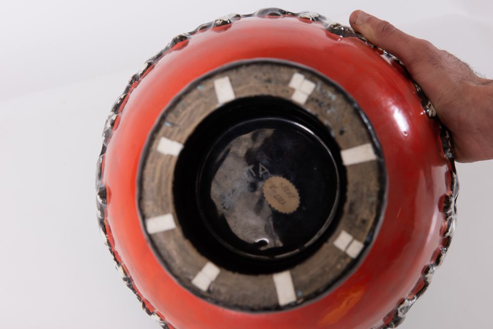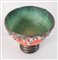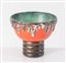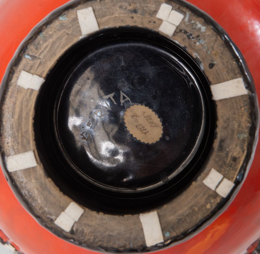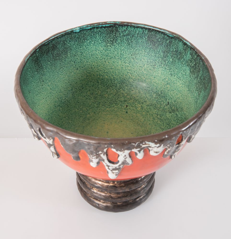 GABRIELE BICCHIONI, C.I.M.A. (Consorzio Italiano Maioliche Artistiche), Deruta, anni '30 del XX secolo. Grande coppa dèco, nei colori dell'arancio, verde e nero a riflessi metallici. Cm 27,5xØ32. Sotto la base reca scritta Deruta. Pubblicazione: catalogo CIMA, 1938.