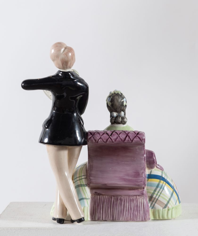 MASSIMO QUAGLINO, MANIFATTURA LENCI Torino, anni 30, "Coppia di innamorati". Terracotta maiolicata realizzata a colaggio e decorata in policromia sui toni del verde e viola pastello. Sotto la base reca iscrizione Lenci - Made in Italy - Torino - n.620. Cm 30x26x25. Pubblicata in A.Panzetta, Le ceramiche Lenci. Catalogo dell'archivio storico 1928-1964, Torino 1992, p. 228, n. 759 (cat. 620)