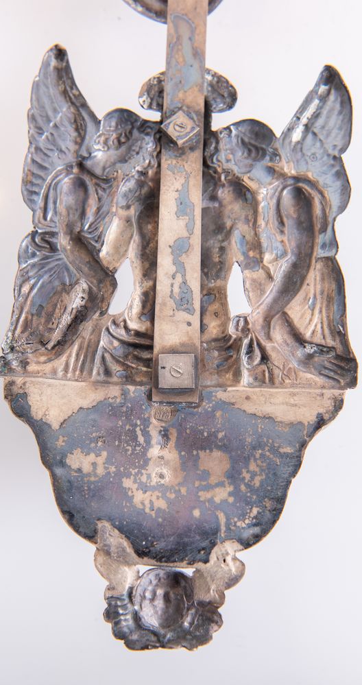 Acquasantiera in argento 800. Al retro reca punzoni in uso dal 1812 al 1872 nel Regno Lombardo-Veneto: mondo e trioni, stemma dell'argentiere e stemma di milano. Milano, Regno Lombardo Veneto, dal 1812 al 1872. Cm 20x7,2x3,5. Peso: 58 gr.