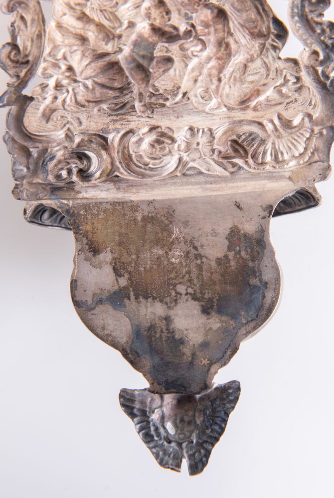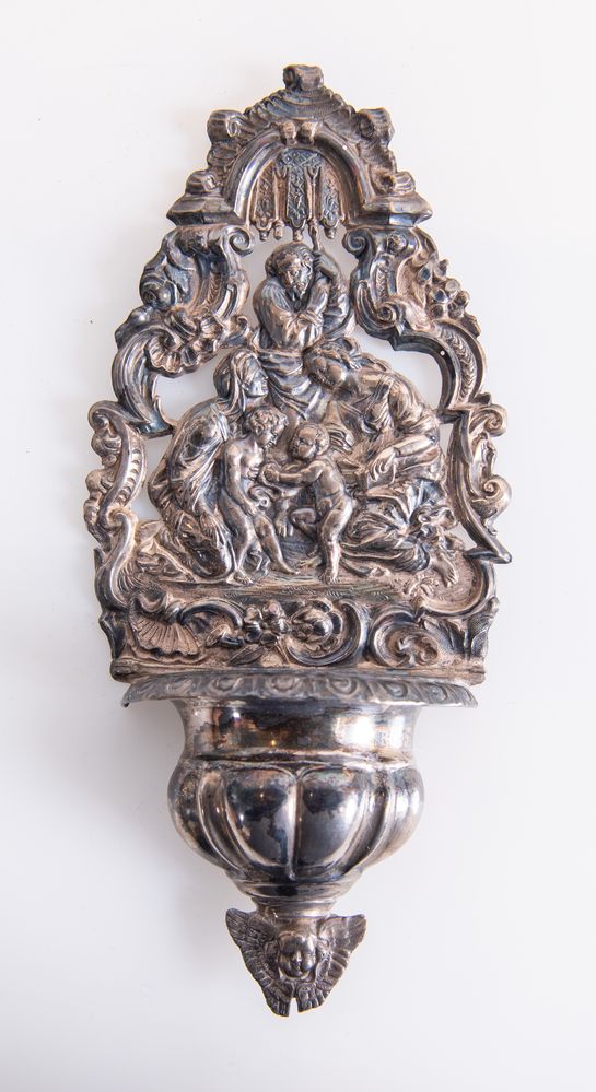 Acquasantiera in argento 800. Al retro reca punzoni in uso dal 1812 al 1872 nel Regno Lombardo-Veneto: mondo e trioni e stemma di milano. Milano, Regno Lombardo Veneto, dal 1812 al 1872. Cm 20,5x9,5,3,5. Peso: 52 gr. (difetti e rotture)