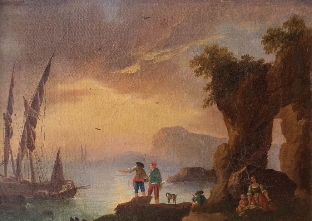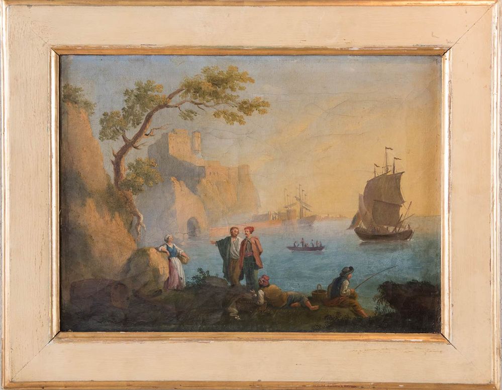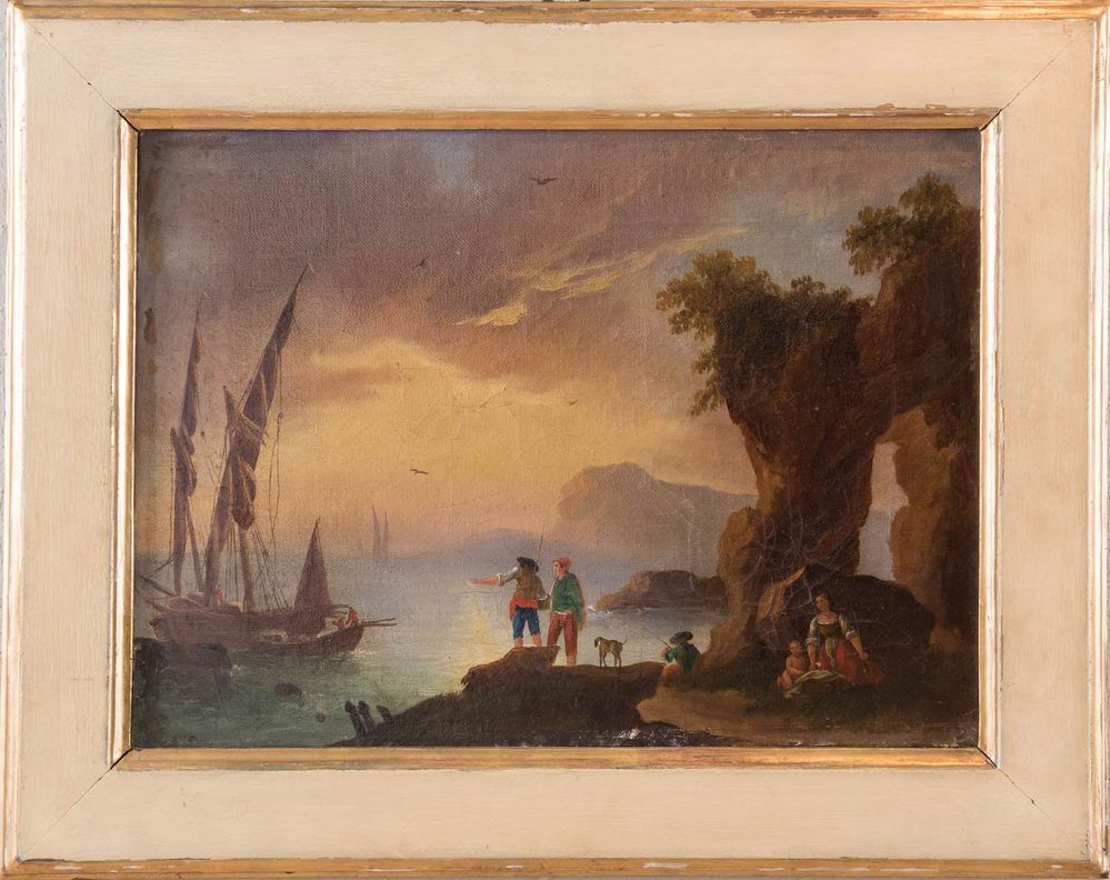 Maestro degli inizi del XIX secolo. Coppia di marine. Olio su tela. Cadauno di cm 34x47.