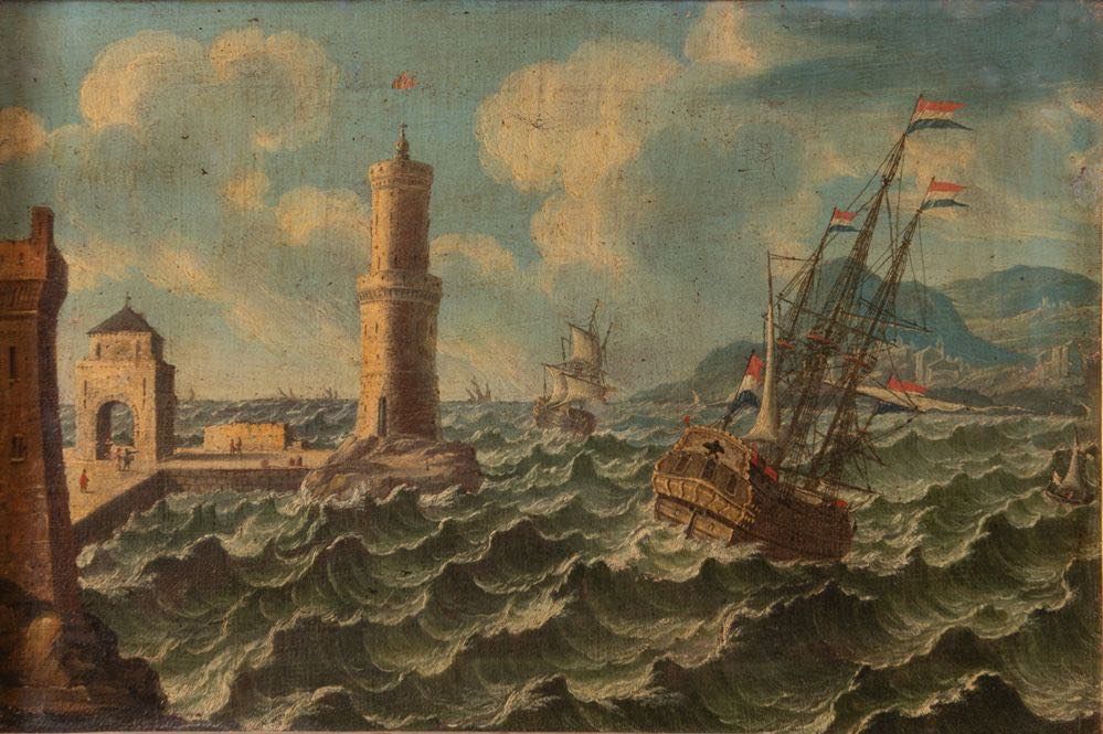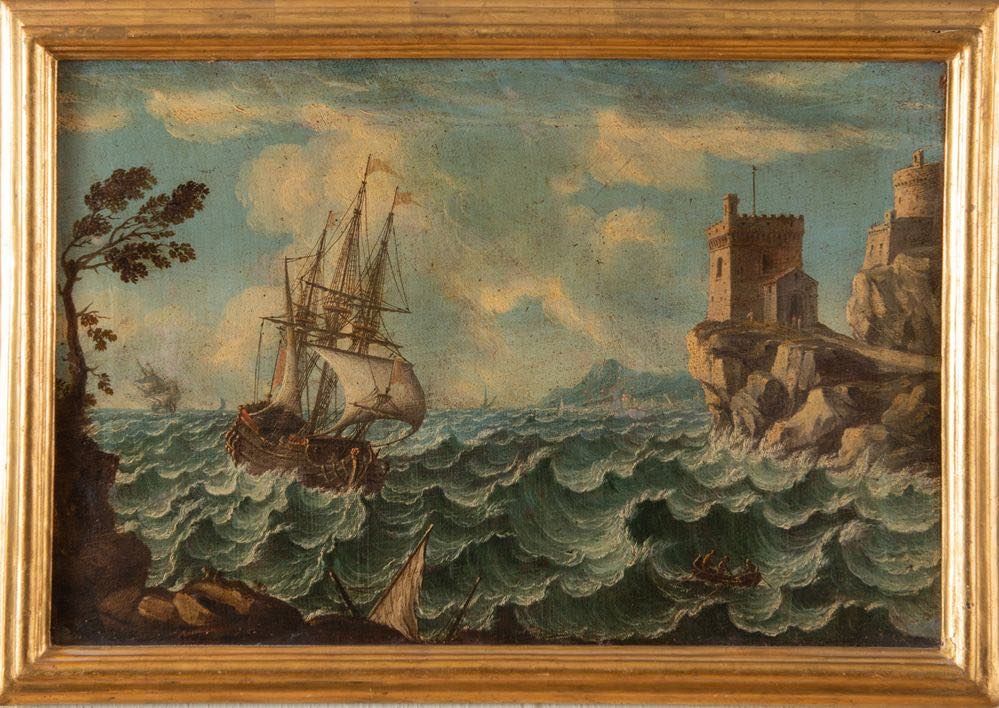 ORAZIO GREVENBROECK, attr. “Marine in tempesta”. Coppia di oli su tela. Cadauno di cm 34x50.