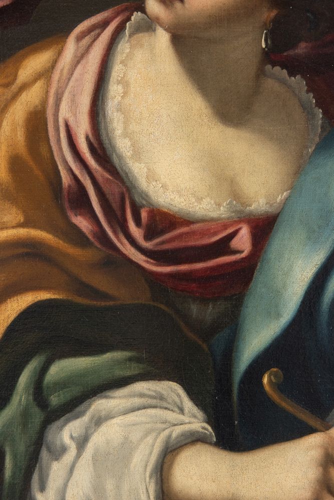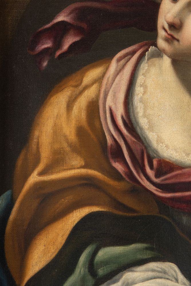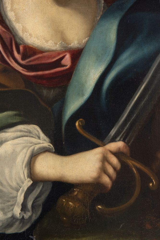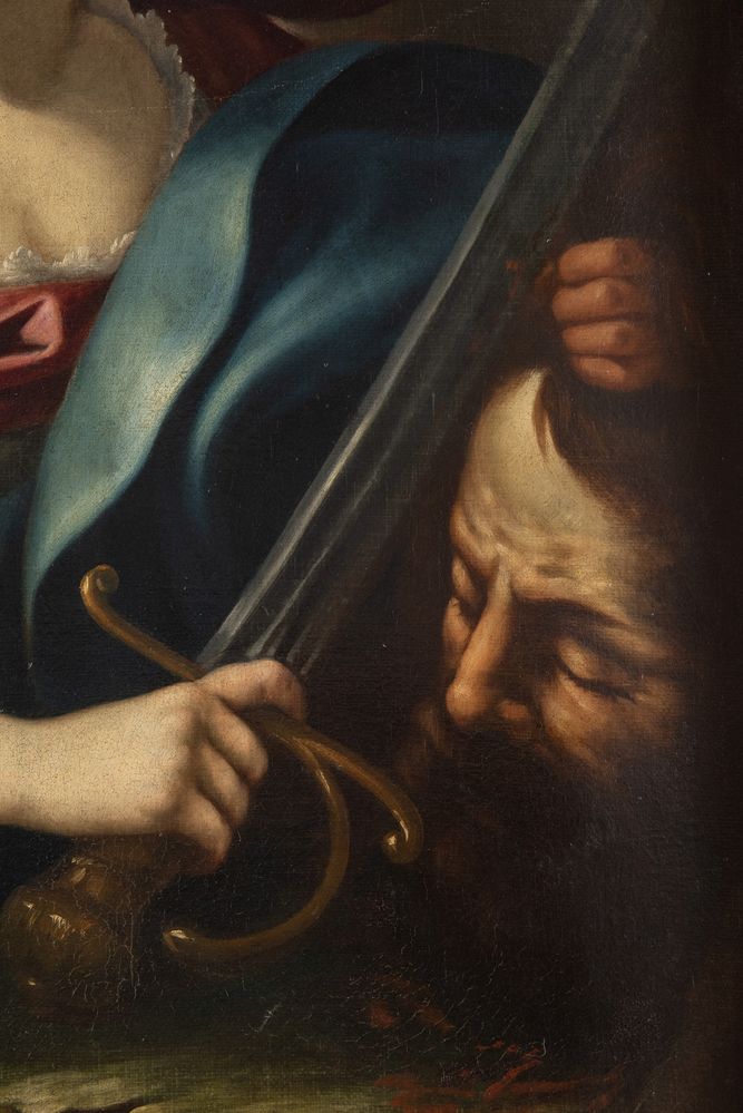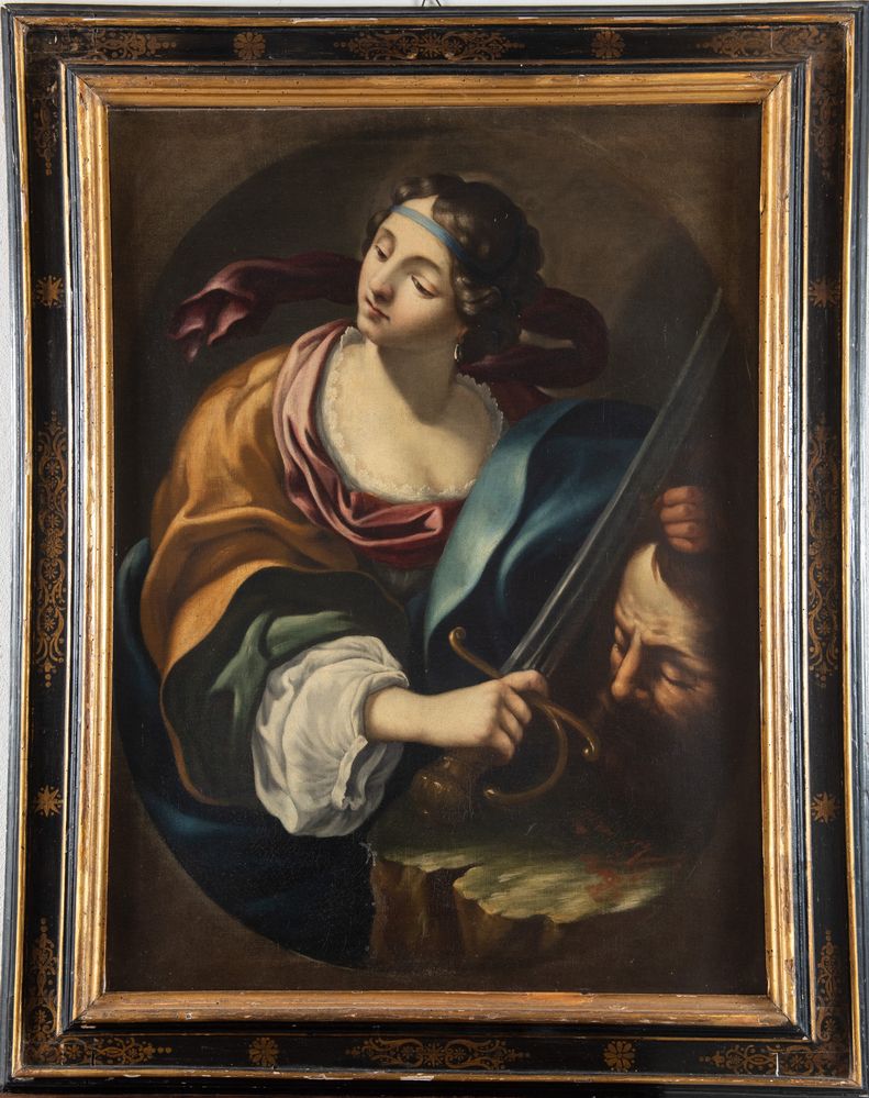 Maestro del XVII secolo. "Giuditta con testa di Oloferne". Olio su tela. Cm 94x70.