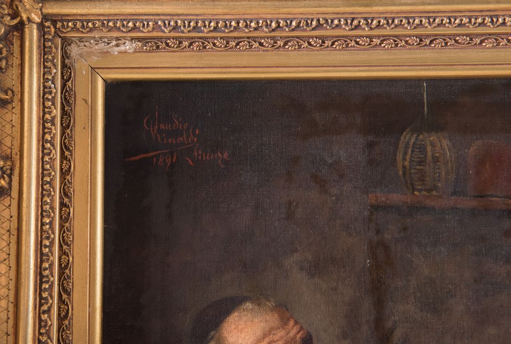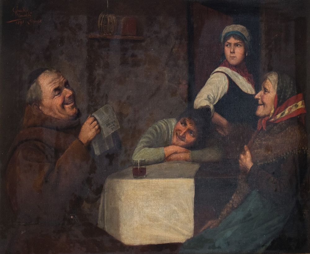 CLAUDIO RINALDI (Urbania 1852 - 1909) "Il buonumore", 1891. Olio su tela. Cm 44,5x55. Opera firmata e datata in alto a sinistra Claudio Rinaldi 1891.