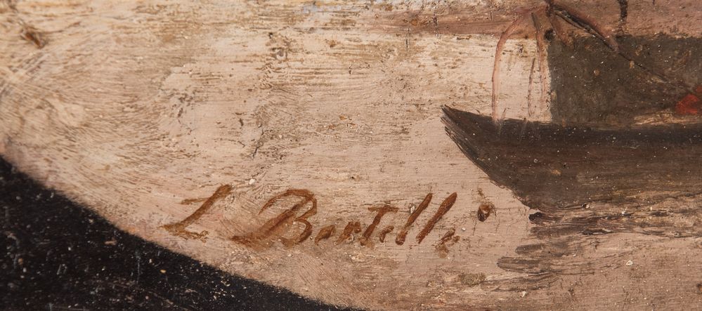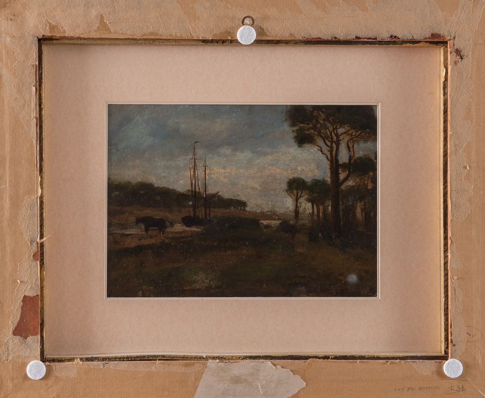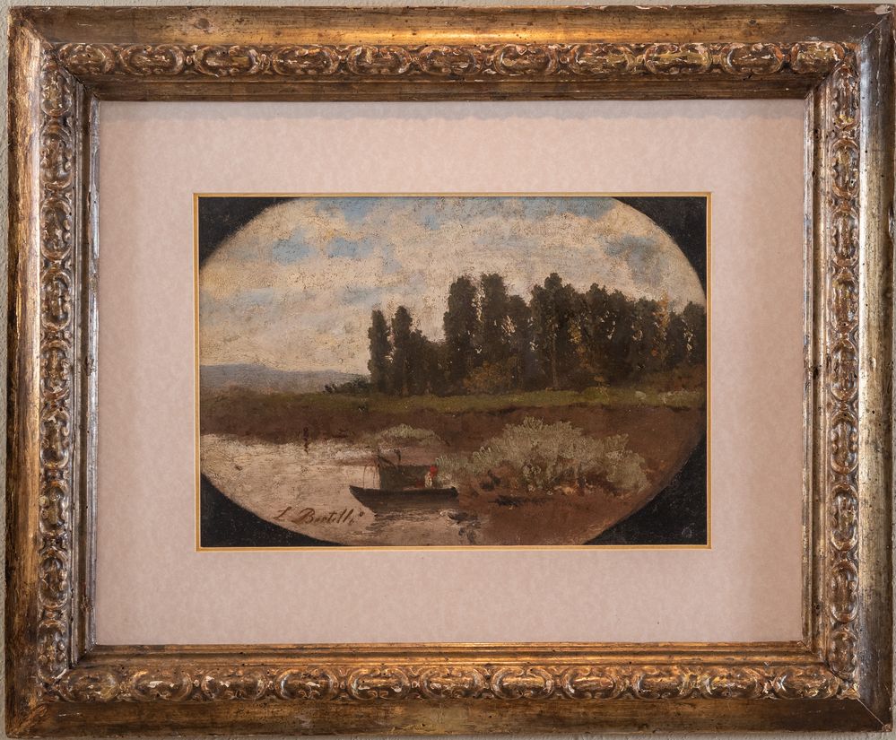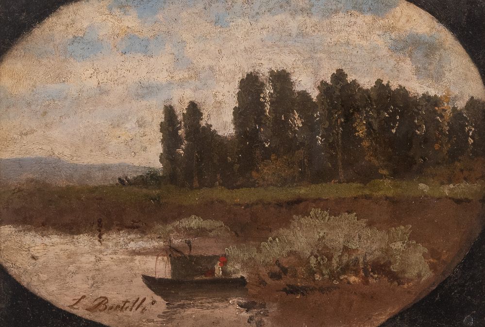 LUIGI BERTELLI (Firenze 1858 - 1920) “Il Reno a Casalecchio”, 1888 circa. Olio su cartone ovale. Cm 24x35. Opera rectoversa. Opera firmata in basso a sinistra. Al retro opera firmata in basso a destra.Pubblicazioni: Galleria Marescalchi, 1976, pag. 57, Ruggeri (Paesaggio in laguna); Allemandi; I dipinti ad olio di Luigi Bertelli, ed. Grafis, pag. 162/163. Esposizioni: Galleria Marescalchi, 1976.