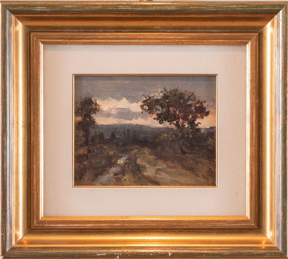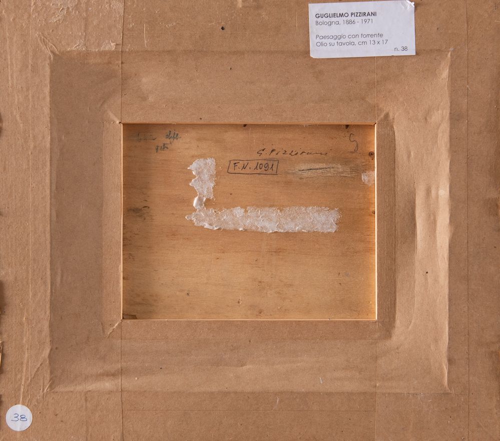 GUGLIELMO PIZZIRANI (Bologna 1886 - 1971) "Paesaggio con torrente". Olio su tavola. Cm 13,5x17,5. Al retro opera firmata G. Pizzirani.