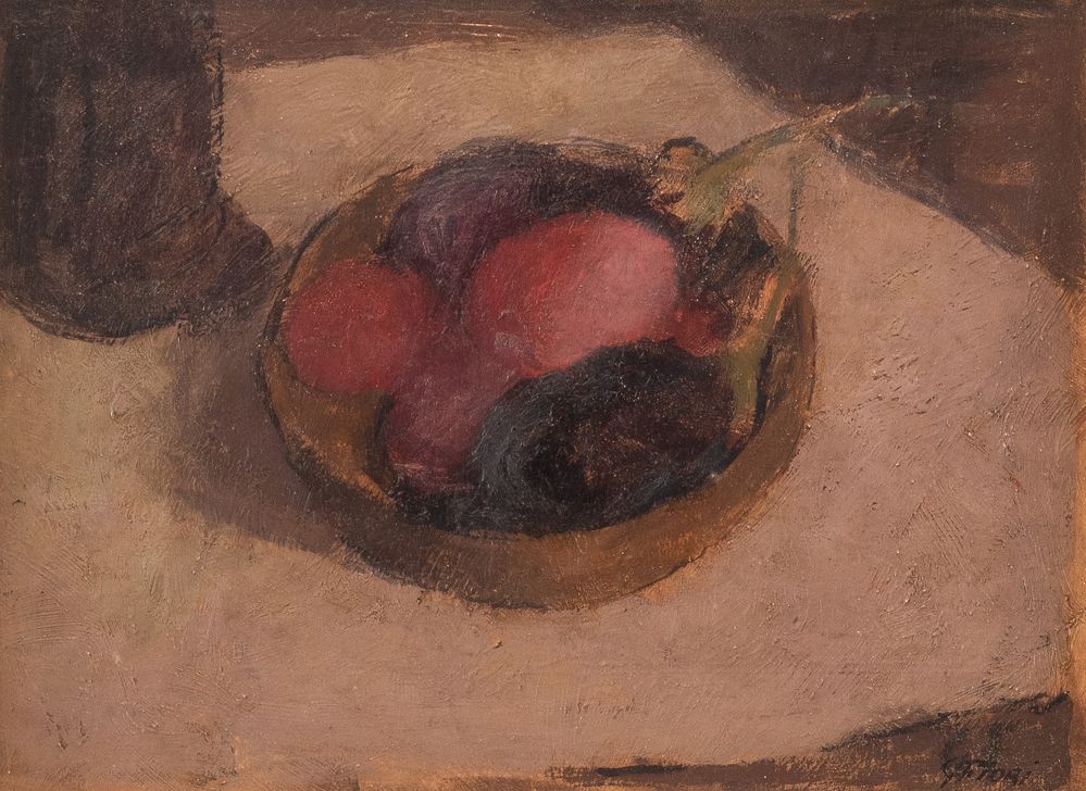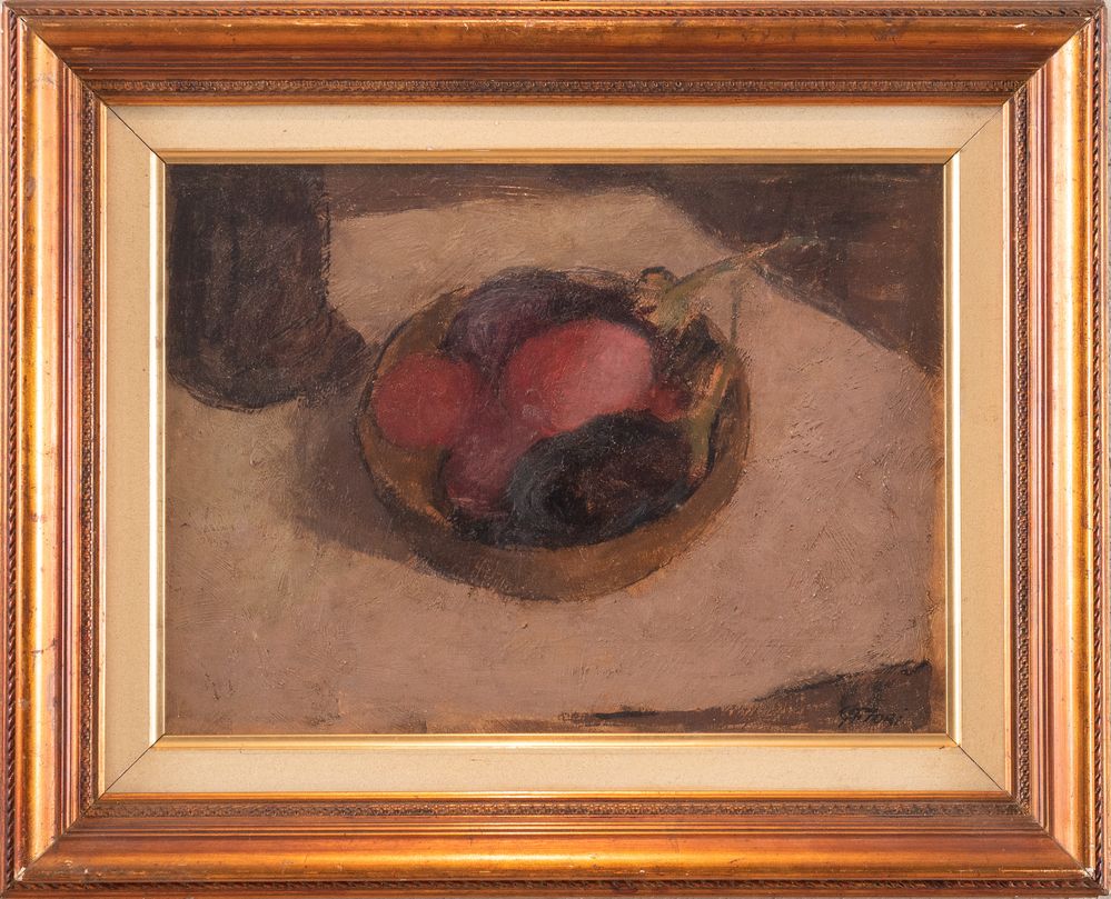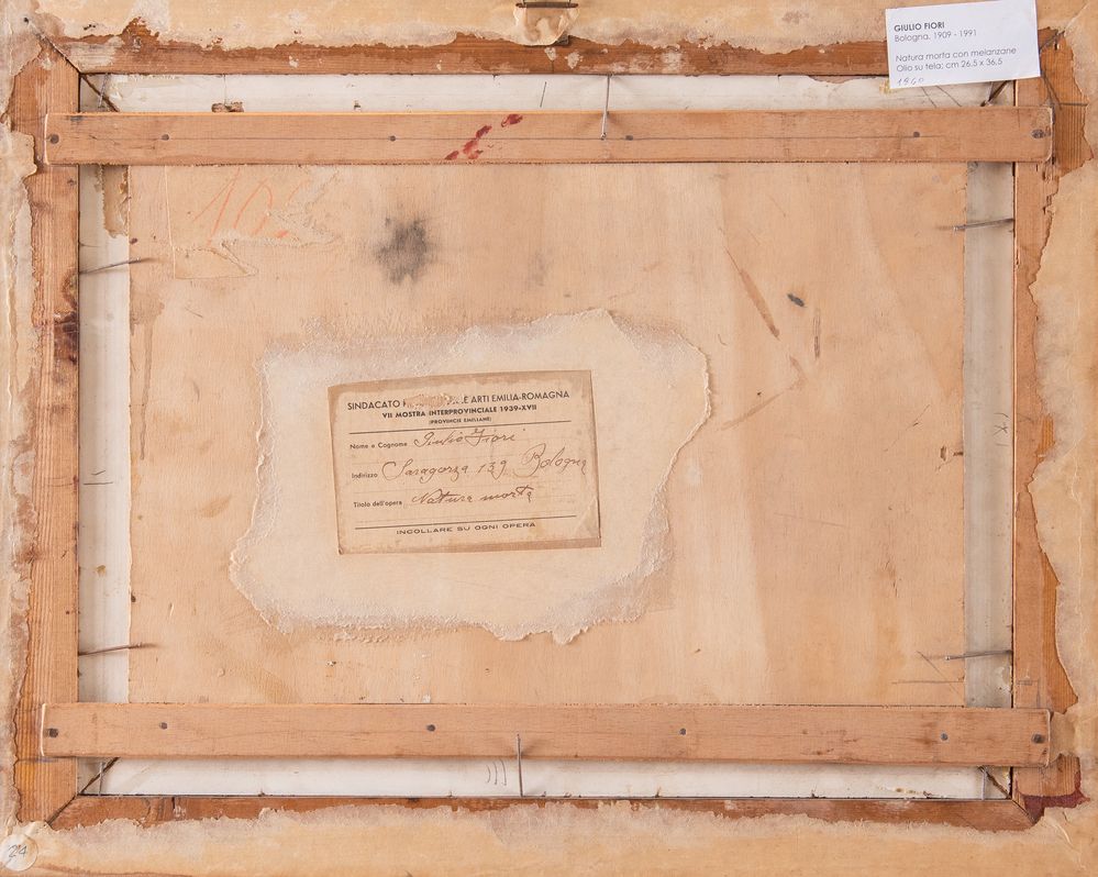 GIULIO FIORI (Bologna 1909 - 1991) "Natura morta con melanzane". Olio su tavola. Cm 26,5x36,5. Opera firmata in basso a destra G. Fiori. Al retro reca etichetta della VII mostra interprovinciale 1939, province emiliane. Esposizioni: VII mostra Interprovinciale 1939, Emilia Romagna.