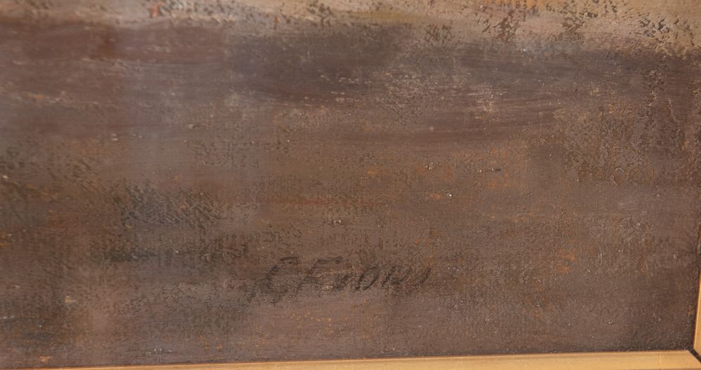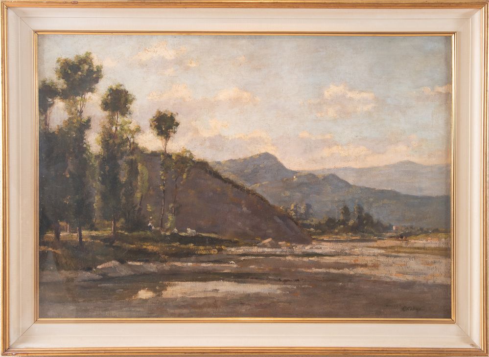 GIULIO FIORI (Bologna 1909 - 1991) "Paesaggio collinare con alberi". Olio su tela. Cm 70x100.Opera firmata in basso a destra G. Fiori.