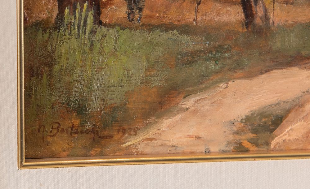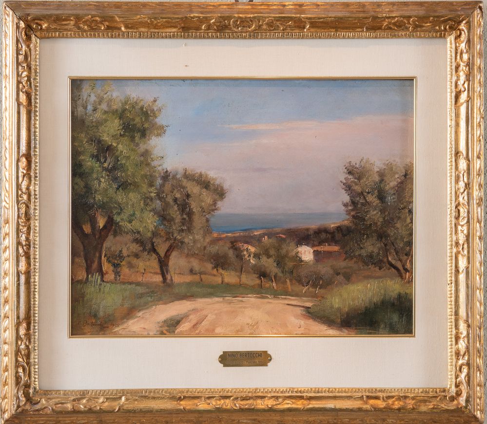 NINO BERTOCCHI (Bologna 1900 - 1956) “Paesaggio”, 1925. Olio su tavola. Cm 33x43. Opera firmata e datata in basso a sinistra N. Bertocchi 1925. Pubblicazione: Allemandi, IX ed. (1991/1992). Dintorni di Bologna.