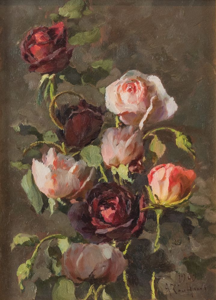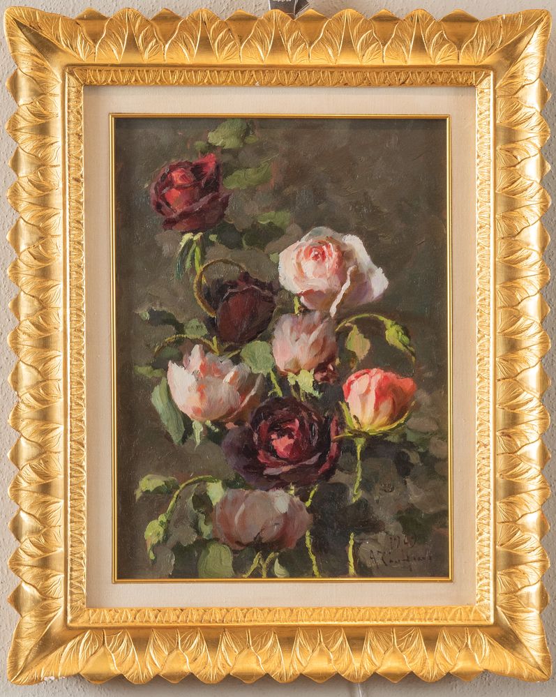 AGOSTINO ZUCCHINI "Rose", 1969. Olio su tavola. Cm 35x25. Opera firmata e datata in basso a destra 1969 A. Zucchini.